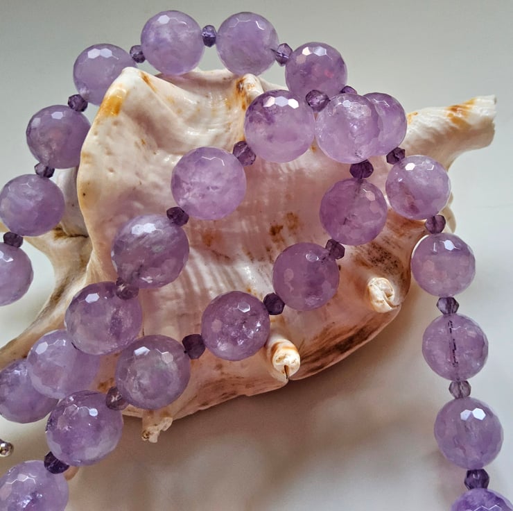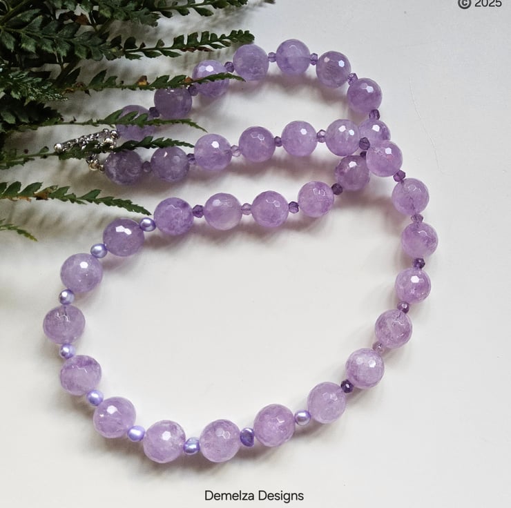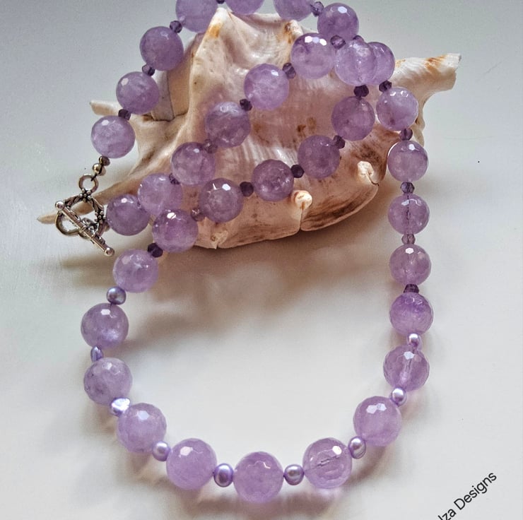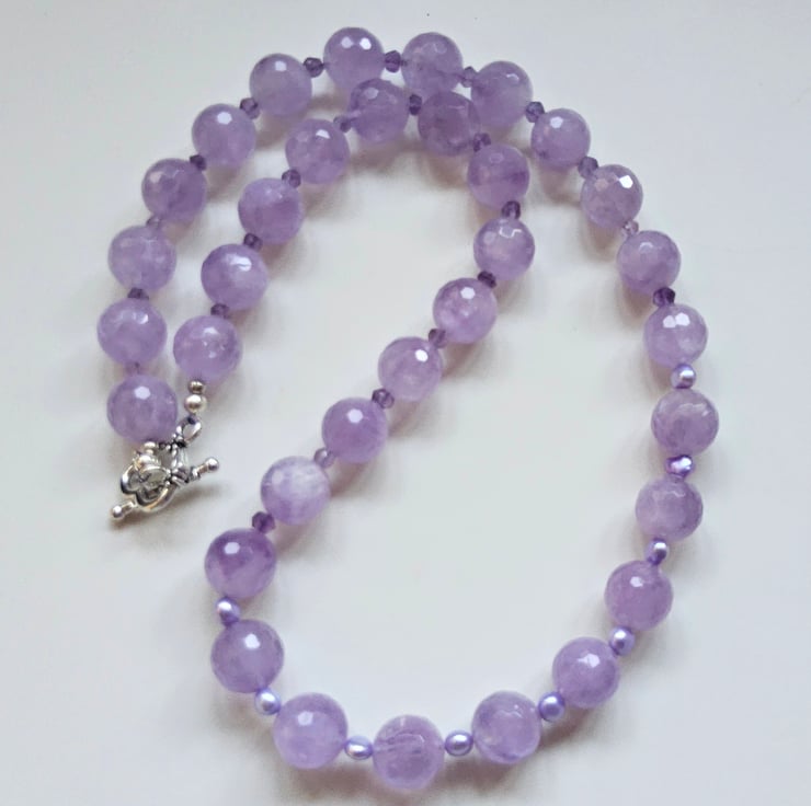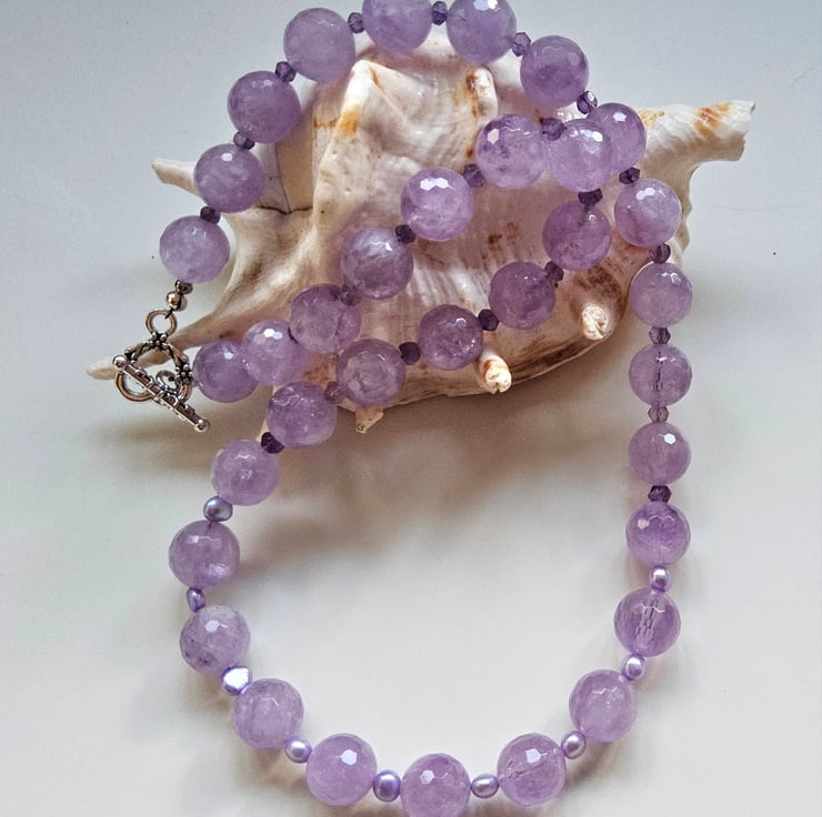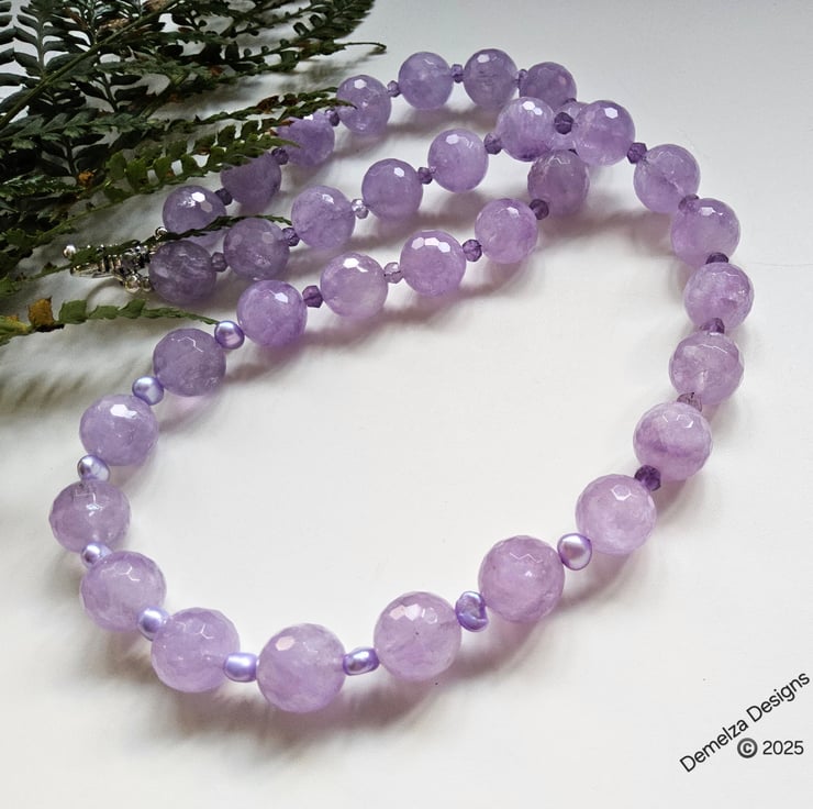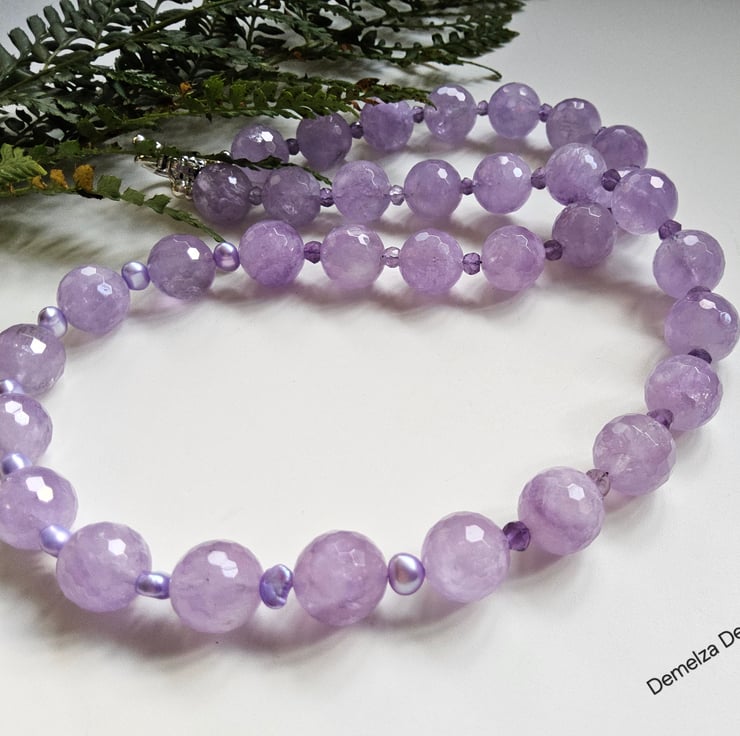 This gorgeous 'one off' 42ct lavender amethyst necklace has been thoughtfully designed and hand crafted by Demelza Designs in Cornwall. The faceted amethyst gemstones are 12mm in diameter. In the necklace centre are nine lavender coloured micro freshwater culture pearls following on with faceted 4mm bicon cut lavender amethyst gemstones.