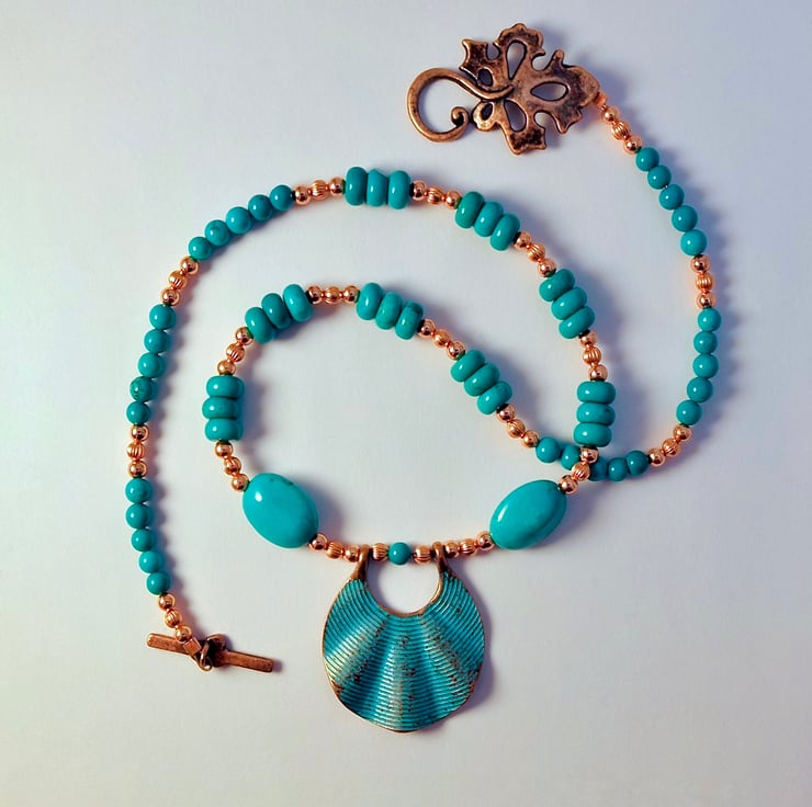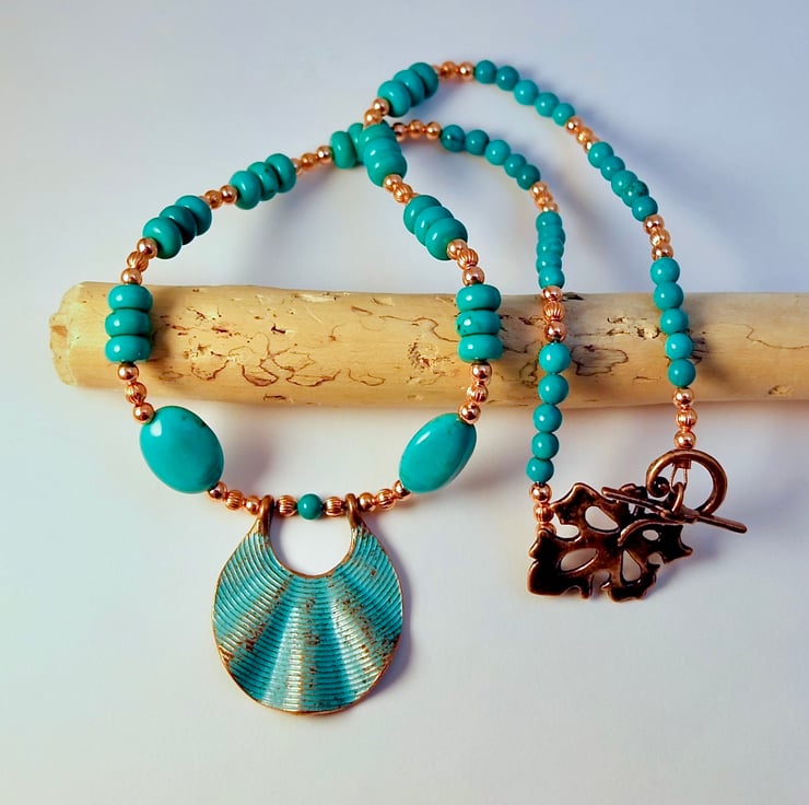 The Turquoise beads are highlighted with trios of pure copper spacer beads, the central one is corrugated adding texture to the piece