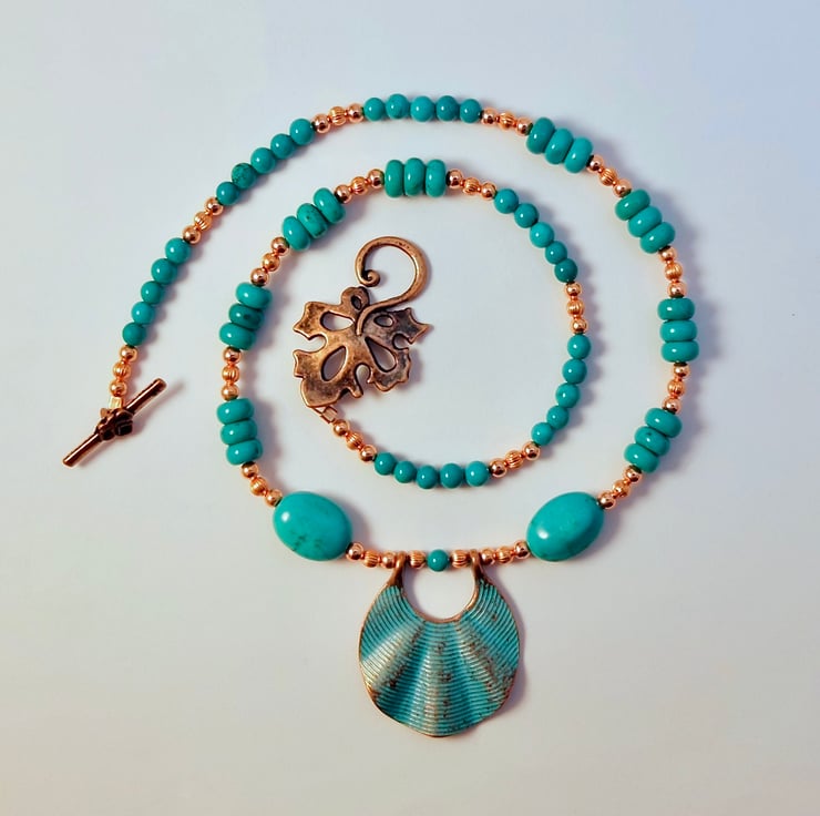 The necklace fastens with an ornate leaf shaped antique copper toggle clasp.