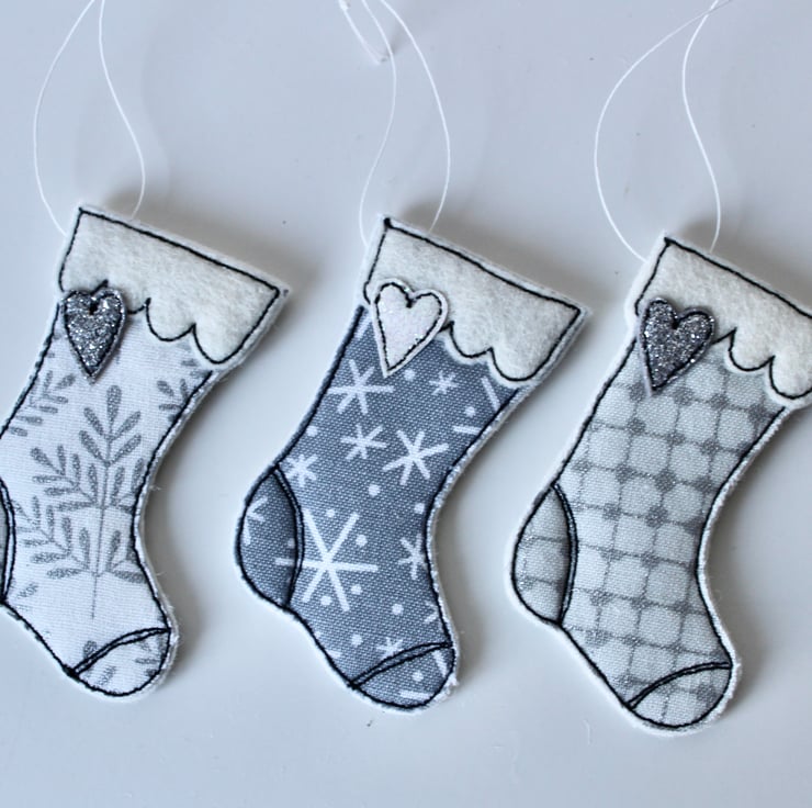 Delightful hanging decorations which are created using 100% wool felt, cotton cloth, glitter cloth, free hand machine embroidery and cut out by hand, using a very sharp pair of scissors.