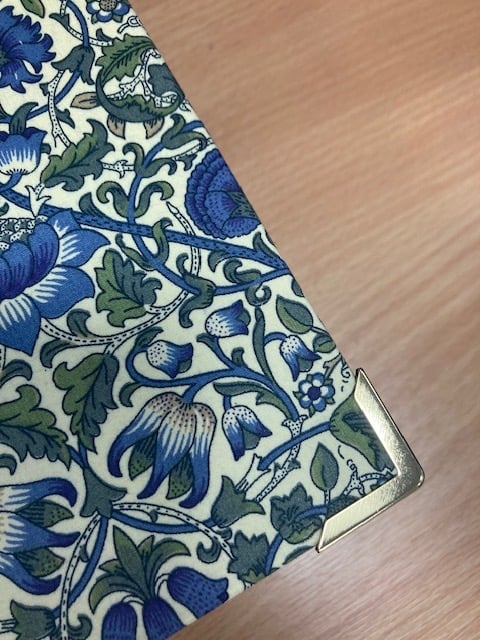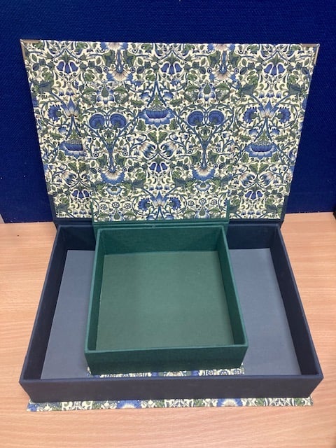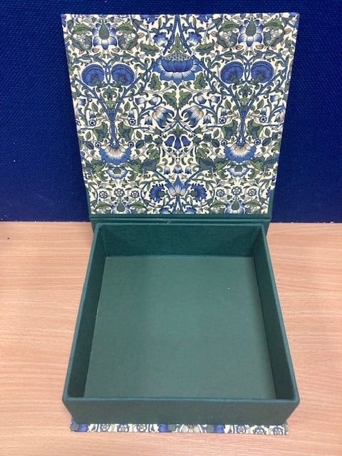 3 Stunning handmade boxes covered in Liberty Loden bookcloth with plain bookcloth in complimentary colours around the sides. Large box has metal corners.