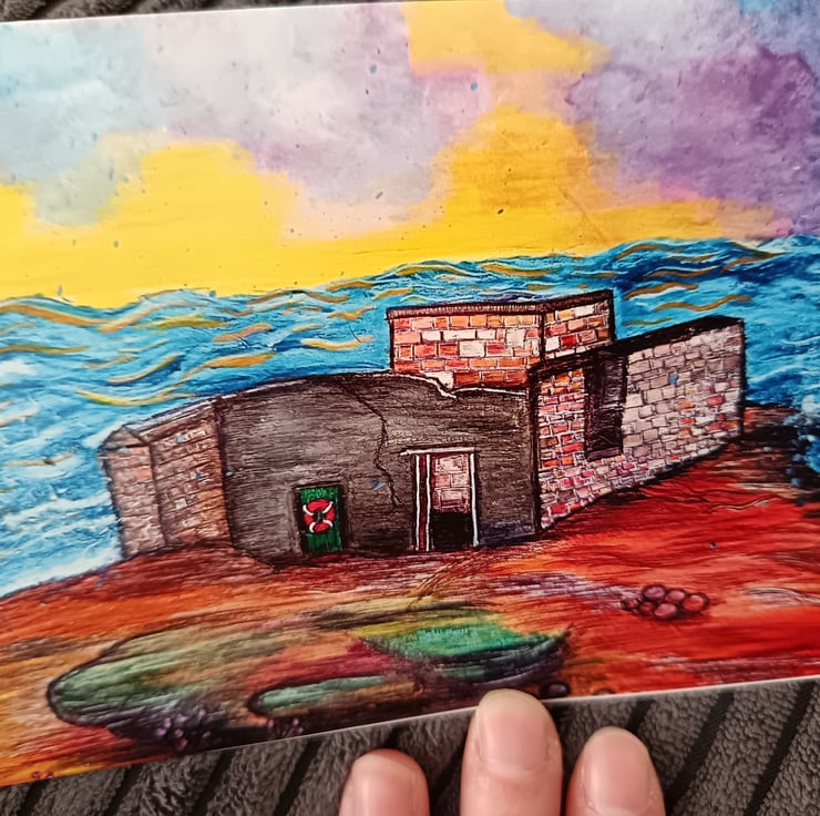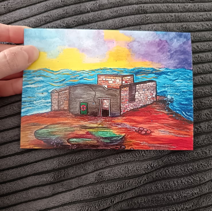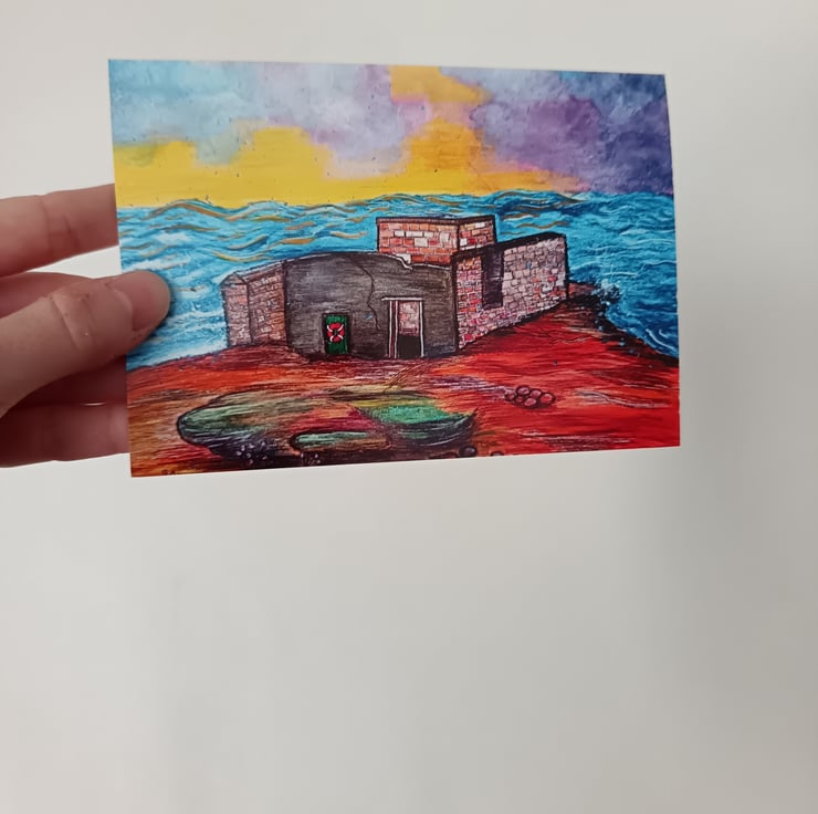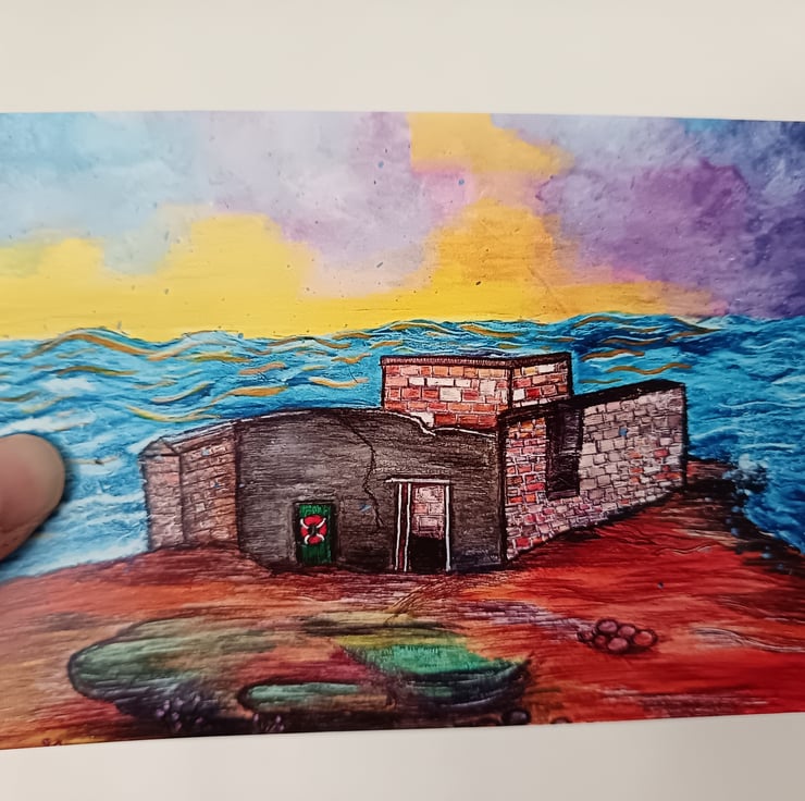 The original work was completed using various mixed media; water soluble wax pastels, acrylic paint and different pens and markers. Under a dramatic sunset, the waves crash around the corner of Hilbre Island and the ruins of the old lifeboat station.