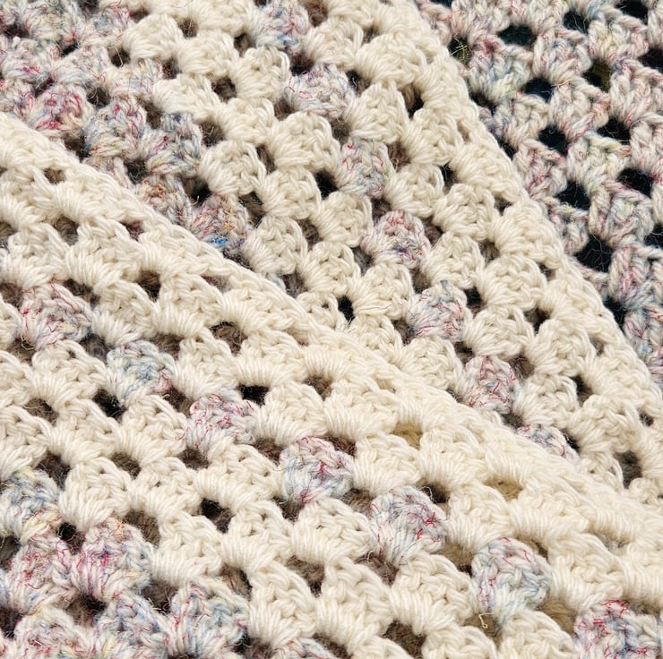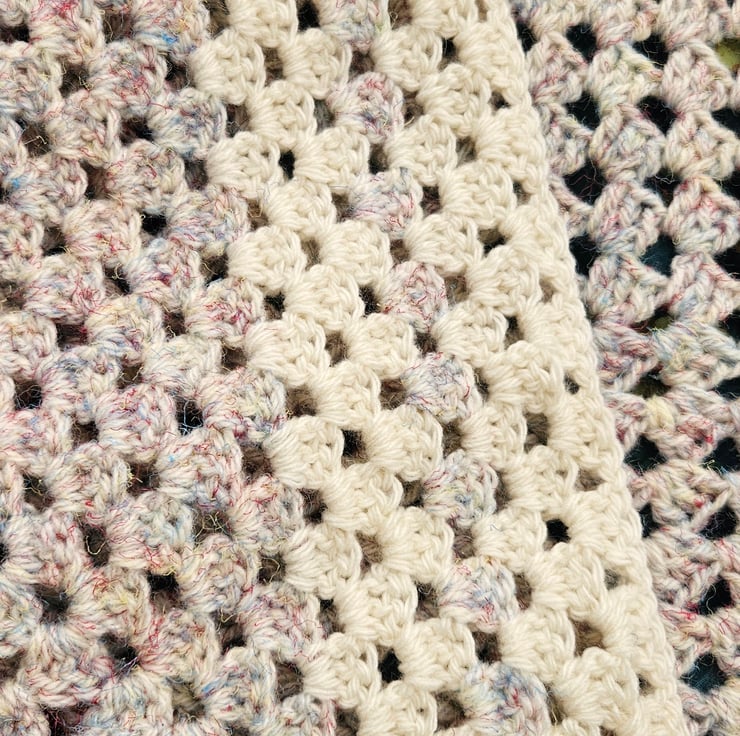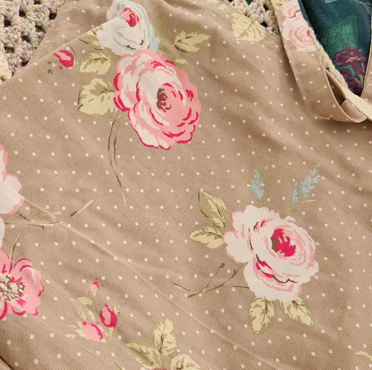 A giant crocheted lap blanket in chunky yarn, creams and variegated colours. Ideal for those chilly evenings. The tote bag is upcycled from curtain fabric featuring roses.