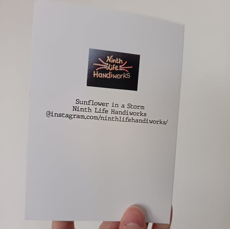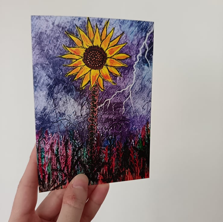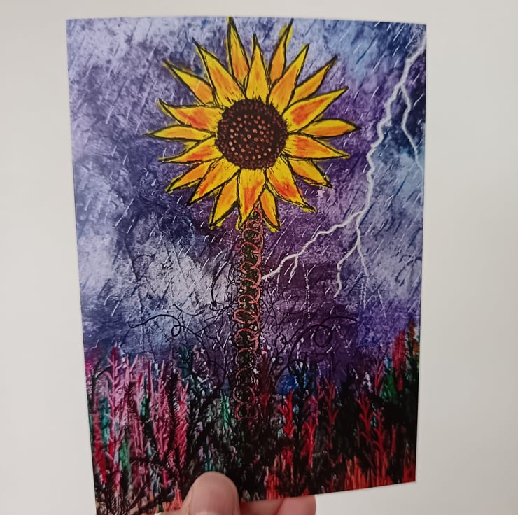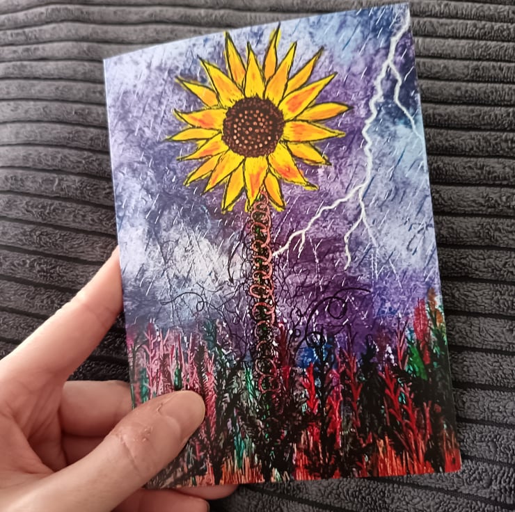 This A6 greetings card features a print of my original painting Sunflower in a Storm on 360 gsm silk card, left blank inside for your own message, and comes with an A6 white envelope.