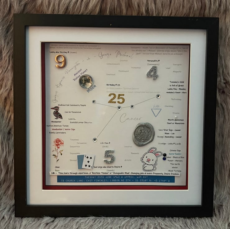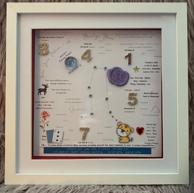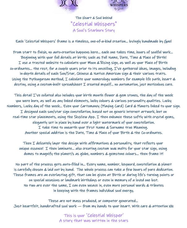 Beginning with your full details at birth, such as Full Name, Date, Time & Place of Birth! Calculating your Starsign/Sun, Moon & Rising sign, as well as Chinese & Native American signs. I calculate numerology numbers specific to you. The frame also includes your birth month flower & gemstones, the day of the week you were born, as well as any linked elements, lucky colours & various personality qualities. Lucky Numbers, Lucky day of the week… Even your Cartomancy (Playing Card) Card & Planets linked to your sign. I designed each sun/star sign constellation, which I enhance softly with crystal gems.