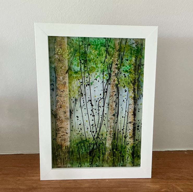 A beautiful and unique fused glass panel of woodland birch trees created using three layers of glass to create depth. The panel has been built up using coloured and textured art glass, and kiln fired, then crushed glass, powders, rods and enamels have been added and the panel fired for a second time.
