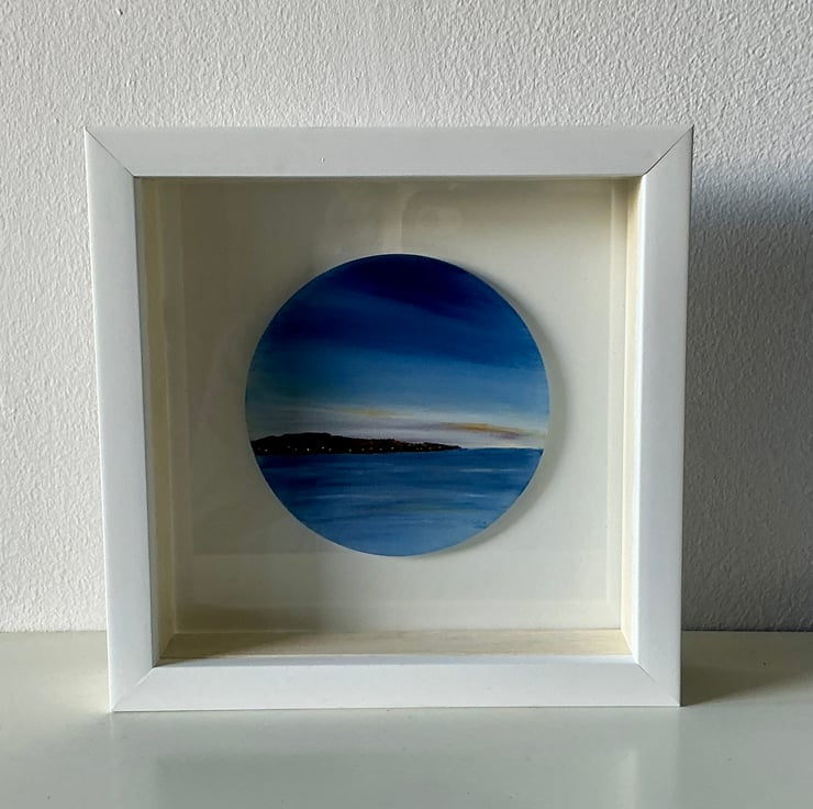 This miniature scene of a headland viewed from the ocean at twilight has been hand-painted onto a circular glass panel using specialist glass enamels. In a two stage process, a light background wash is first applied and kiln fired to set the enamel. Once cooled, more detail is added, in the form of a streaky twilight sky, ocean detailing, and lights twinkling on the headland and the panel fired again.