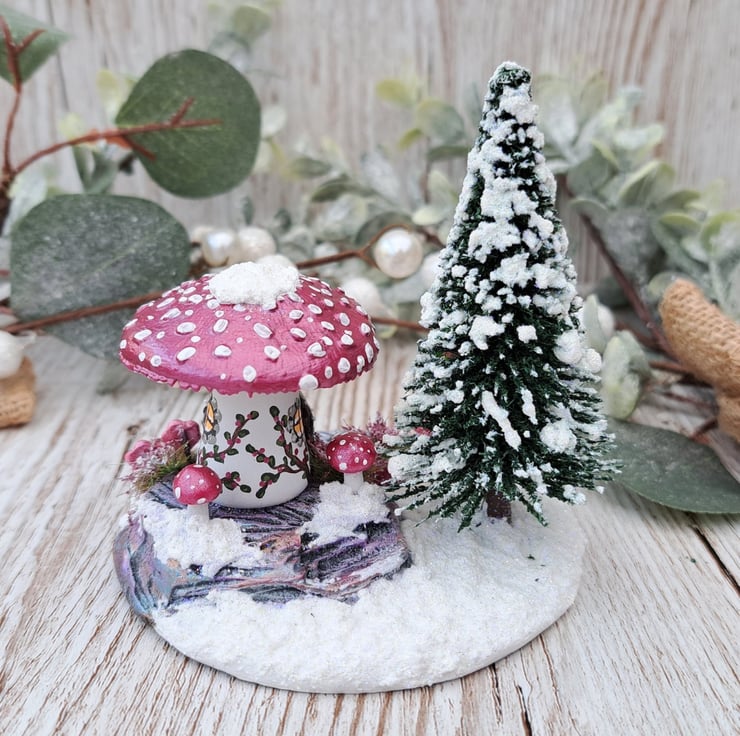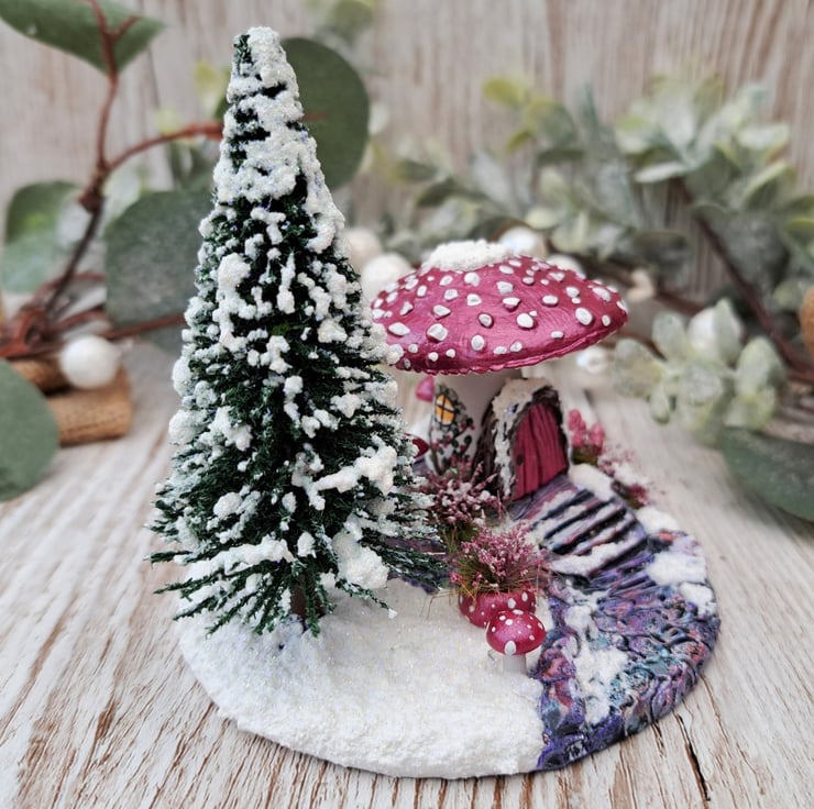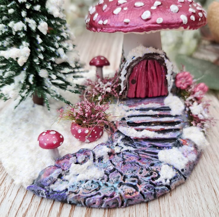 This handmade snowy toadstool house scene is made from air drying clay and hand painted in pretty metallic colours.