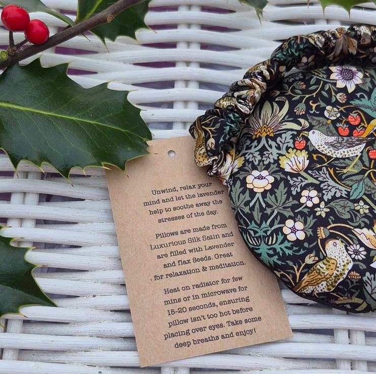 Materials Silk. Cotton. Lavender,Flaxseed & Elastic. Mask can be put in the microwave but only for 15 seconds at a time. Ensure mask is not too hot before placing over eyes.