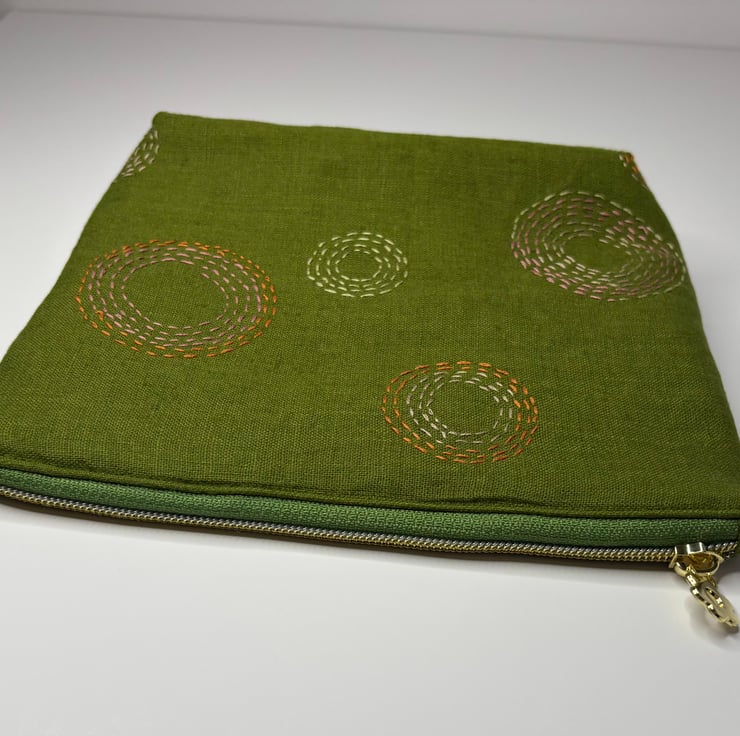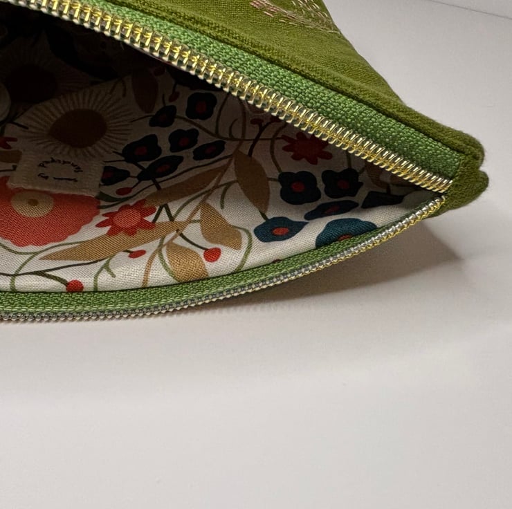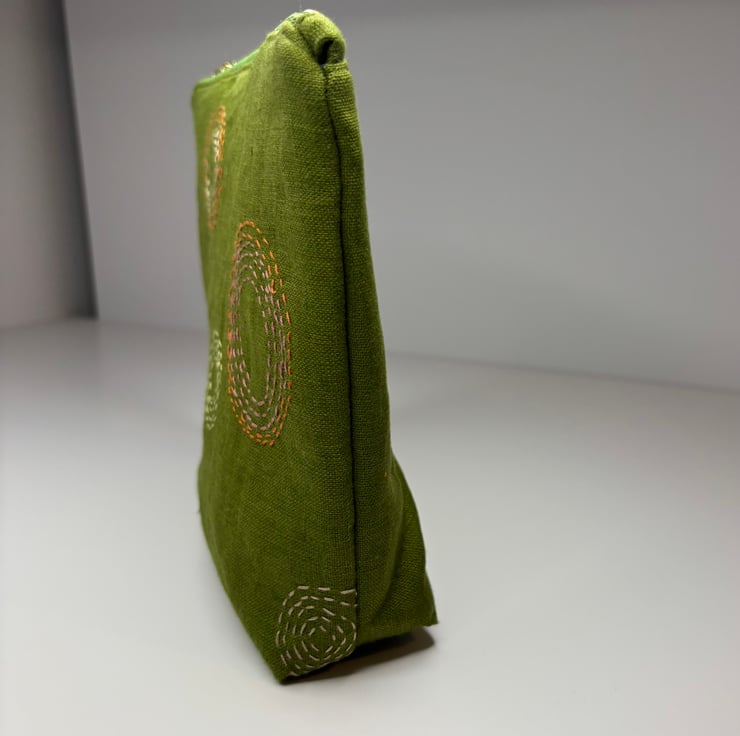 A versatile zip top purse / pouch / small bag. Made from a gorgeous Linen with hand stitched detail on the front, the back is plain.