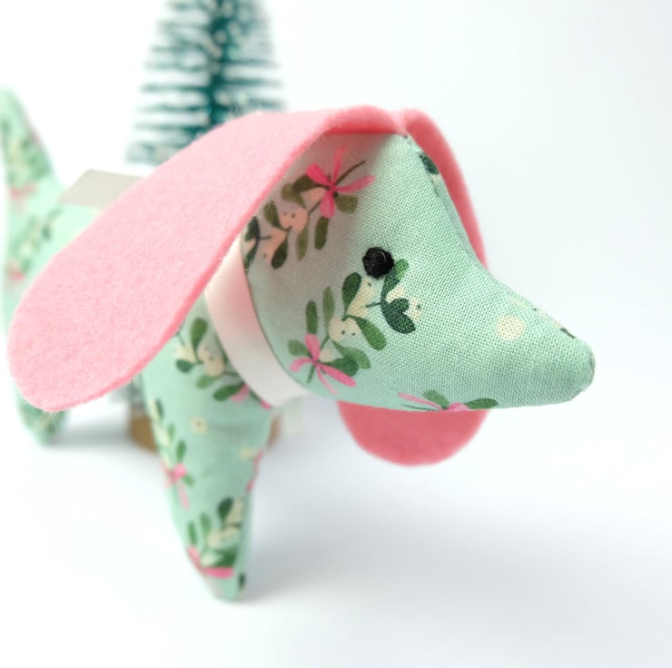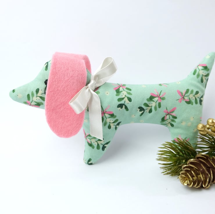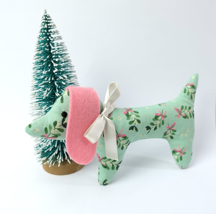 A pretty little flappy eared lavender dog sachet, in festive mint coloured mistletoe fabric, with a print of sweet mistletoe sprigs tied with pink bows. The dog makes a lovely bedroom decoration, and also adds a delicious scent if you pop it into clothes drawers. It makes a thoughtful little gift for dog lovers.