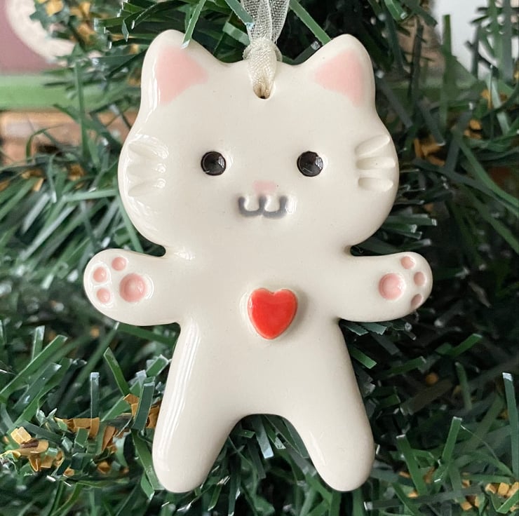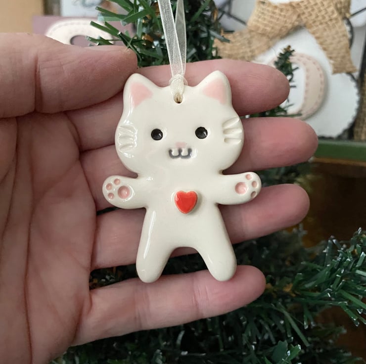This cute little cat decoration is made from white earthenware clay and finished with a little pink nose and red heart. It's really cheerful! It measures 6cm length and 4.5cm width and 0.5cm deep and hangs from a sparkly string.