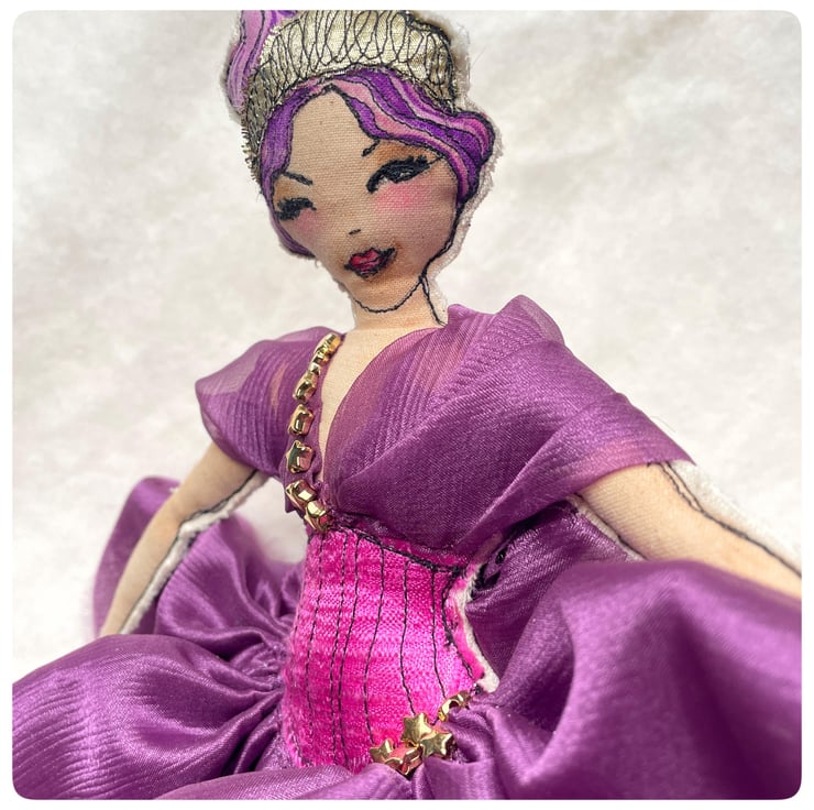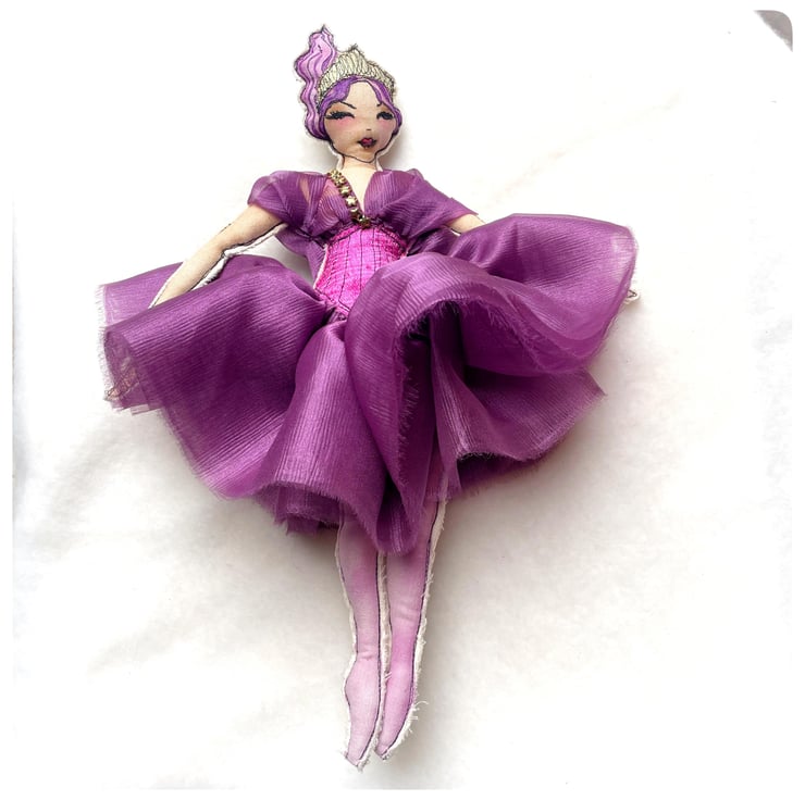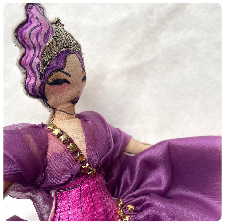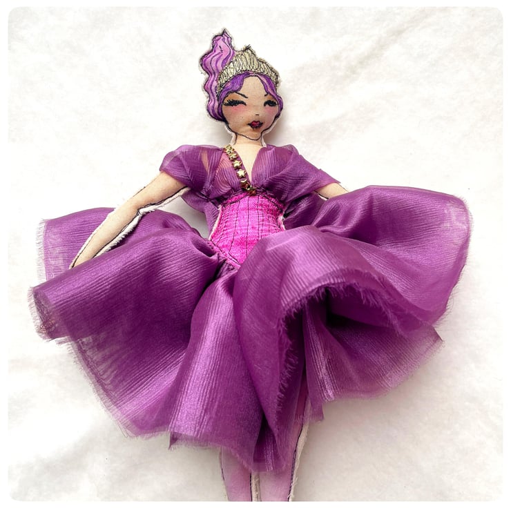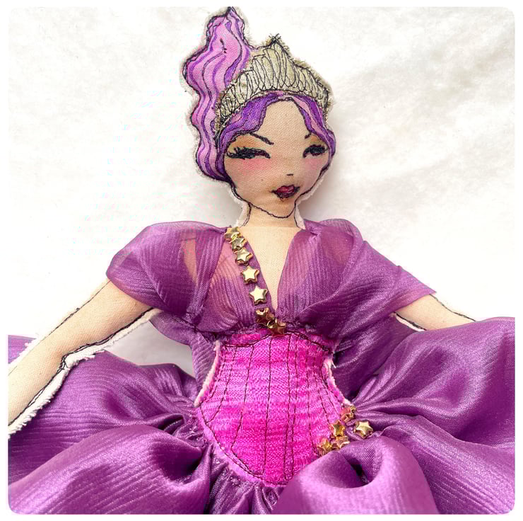 She dances around on tippy toe, smiling sweetly and flicking her oh so purple skirts. She has gold trim to her outfit, and a gold stitched tiara atop her purple painted hair.