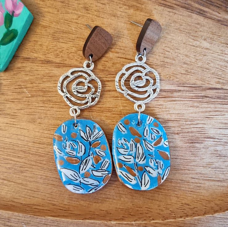 Handcrafted air-dry clay earrings, individually hand-painted with unique designs. Each piece is coated with a glossy resin finish for added durability and shine. Due to the handmade nature of these earrings, slight variations and small imperfections may occur — making every pair truly one-of-a-kind. Lightweight, artistic, and created with love to bring a touch of nature and elegance to your everyday style.