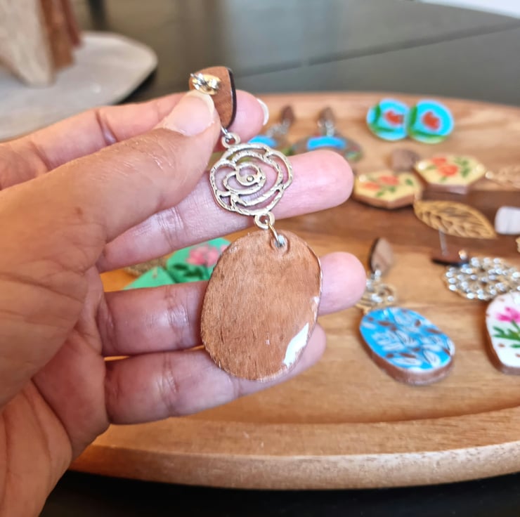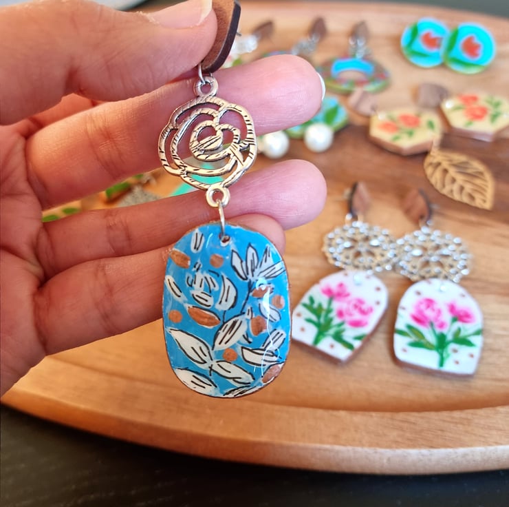 Keep away from water, perfumes, lotions and harsh chemicals to protect the paint and resin finish. Avoid dropping or bending; handmade clay pieces can be delicate. Clean gently with a soft, dry cloth — do not soak or use abrasive cleaners. Store in a cool, dry place, ideally in a jewellery box or pouch to avoid scratches. Slight unevenness or asymmetry is normal due to the handmade nature.