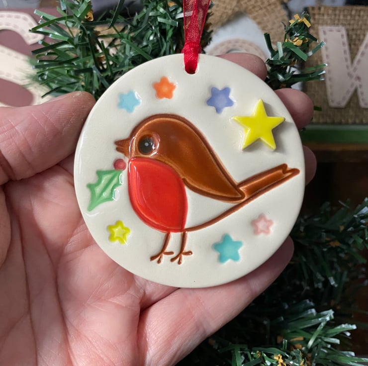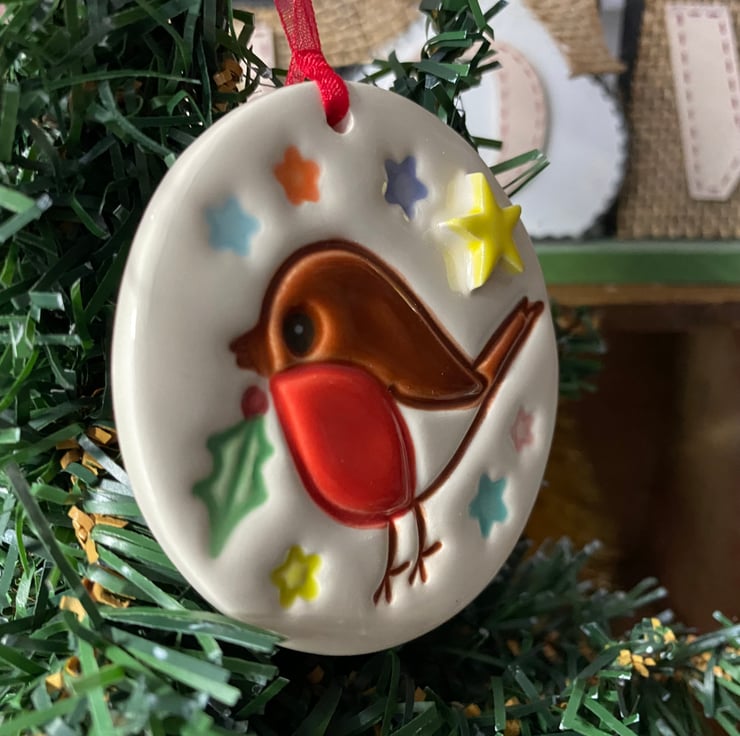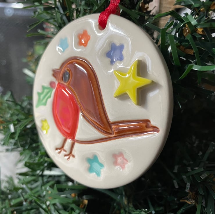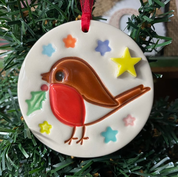This cute little Christmas robin decoration is made from white earthenware clay. It has been imprinted with a robin motif and carefully glazed with the addition of a star. They go through a process of two firings in the electric kiln. This little robin hangs from a red organza ribbon - ready to hang on your tree. Each decoration measures 6.5cm diameter and is glazed in the front only.