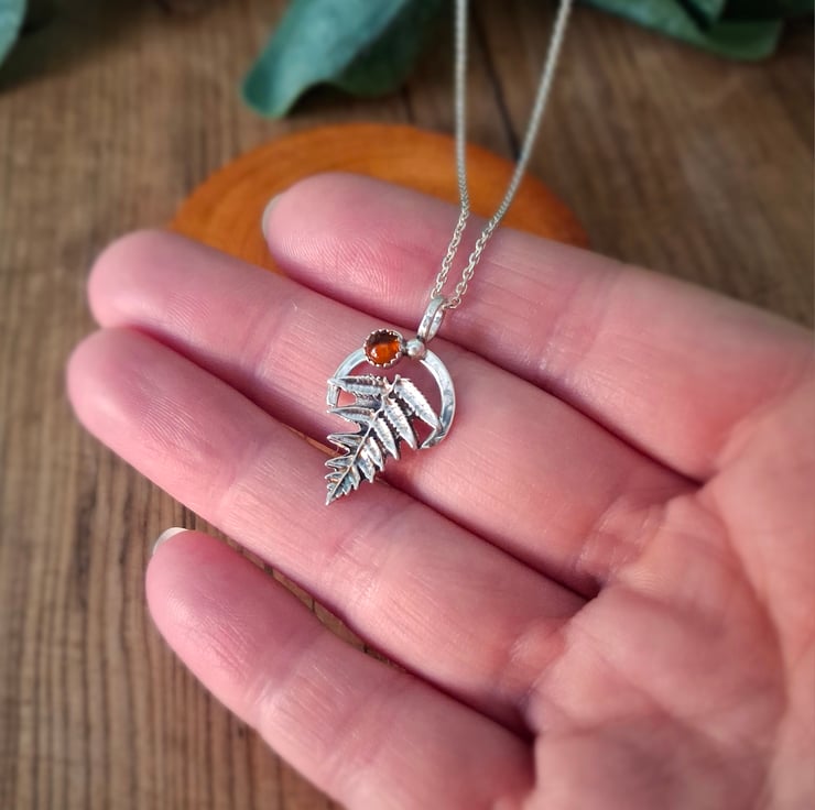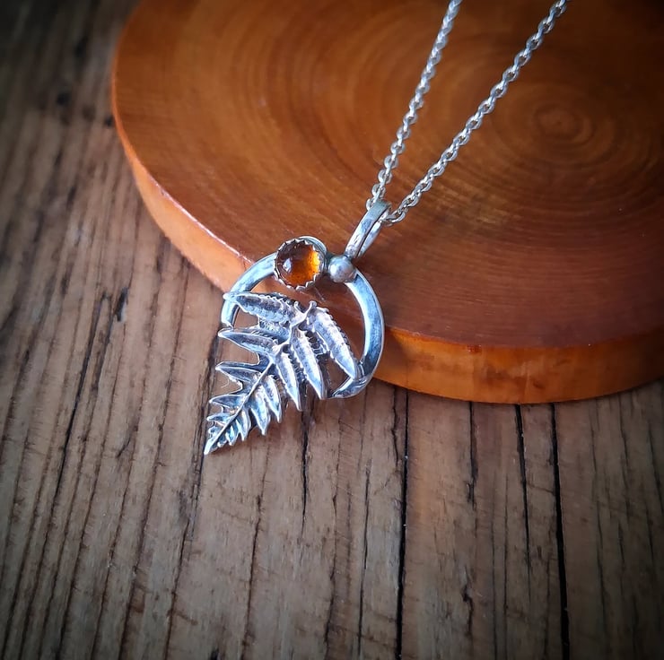 A beautiful autumnal fern leaf with a deep glowing amber stone surrounded by a silver ring. It has a high polished antique silver finish.