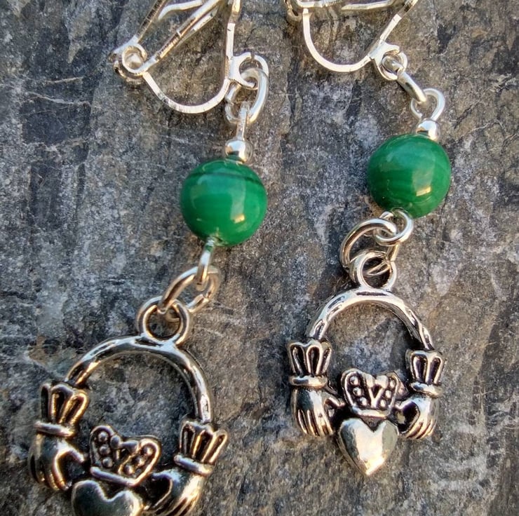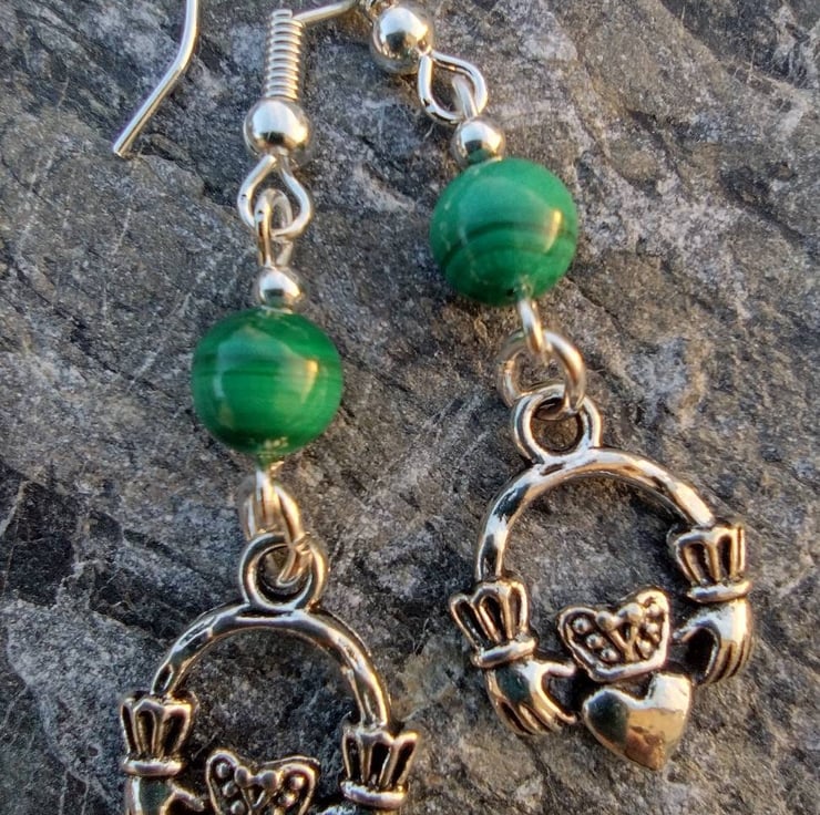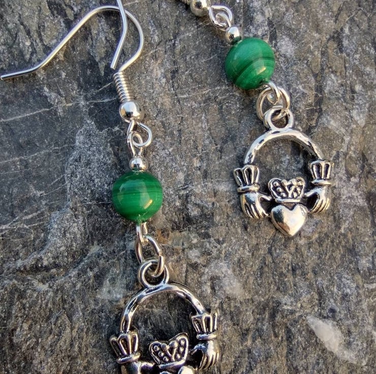 Beautiful genuine REAL Malachite and silver handmade claddagh charm earrings. Made with AA grade, 6mm natural Malachite stone beads on silver plated wire, with tibetan silver Claddagh charms.