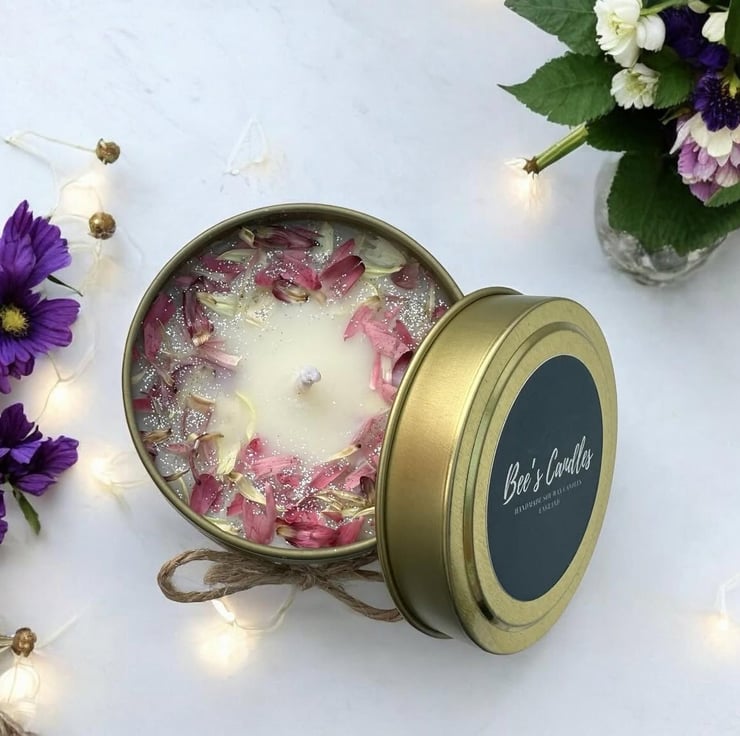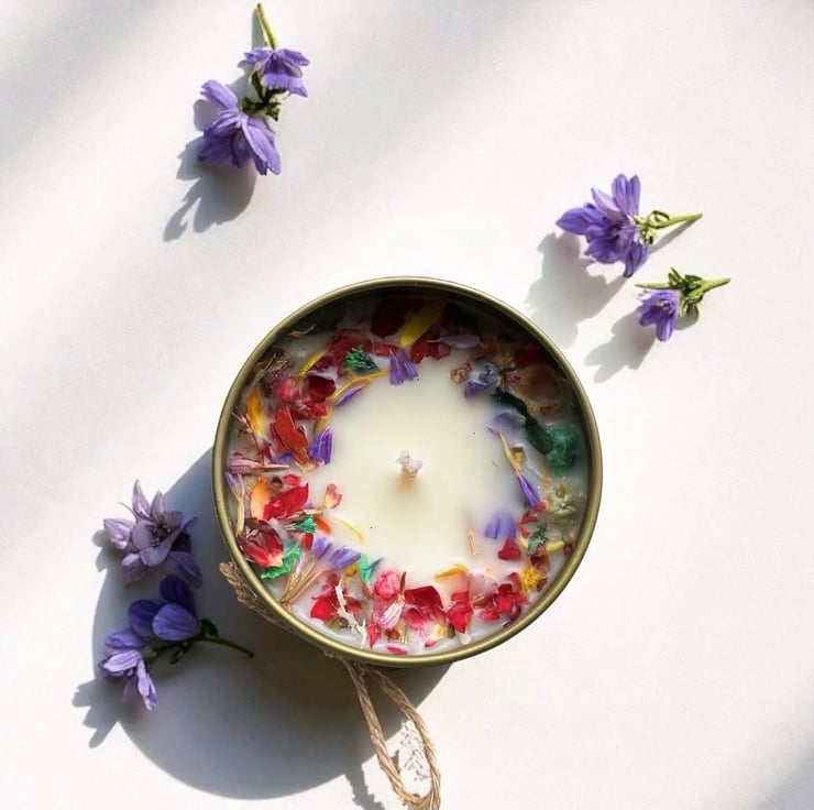 - Candle topped with dried flowers and eco glitter (pink/purple shades used as seen in photos)