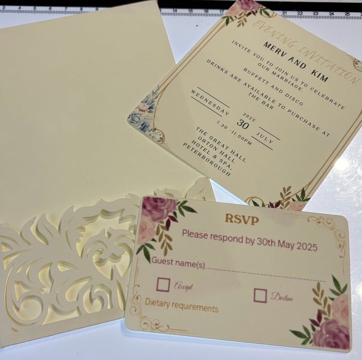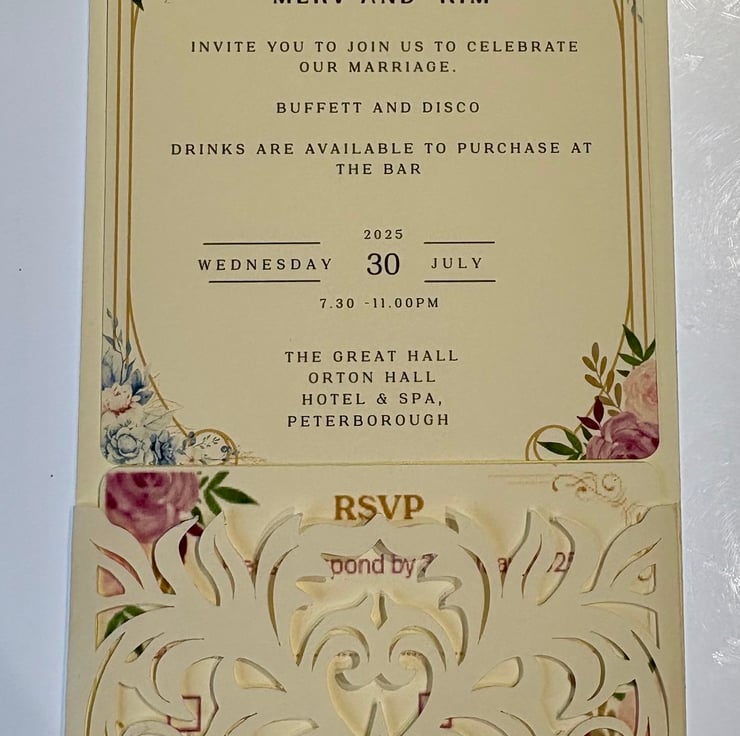 Make your special day feel even more magical with these beautifully handcrafted Floral Lace Evening Wedding Invitations. Each invitation features an elegant vintage-inspired floral design, printed on premium card and framed with warm gold detailing. The card slides into an intricate cut lace pocket, adding a luxurious layered finish that feels truly special.