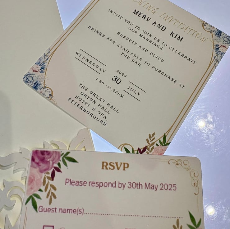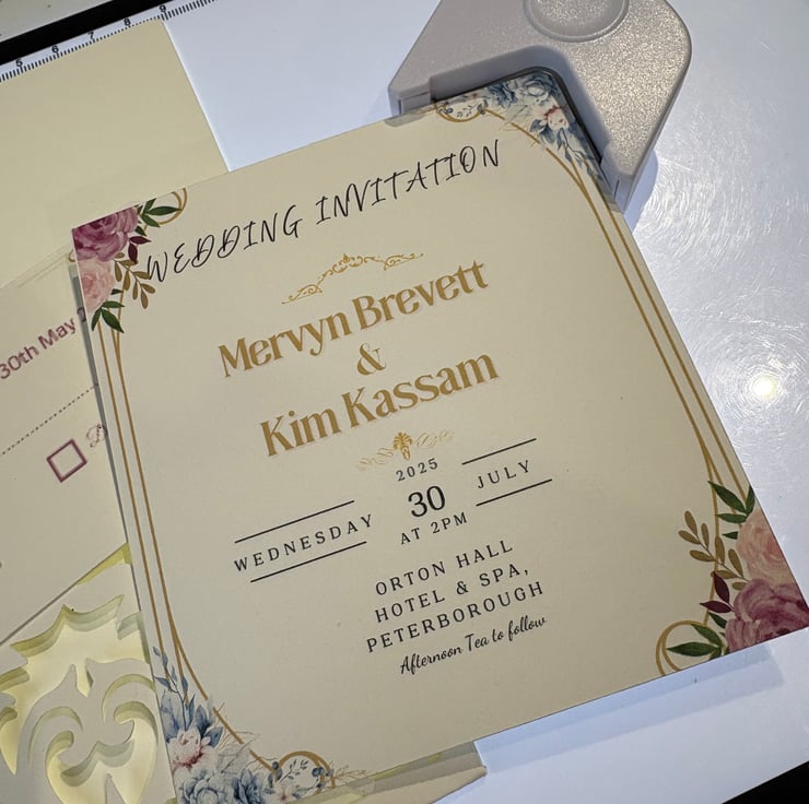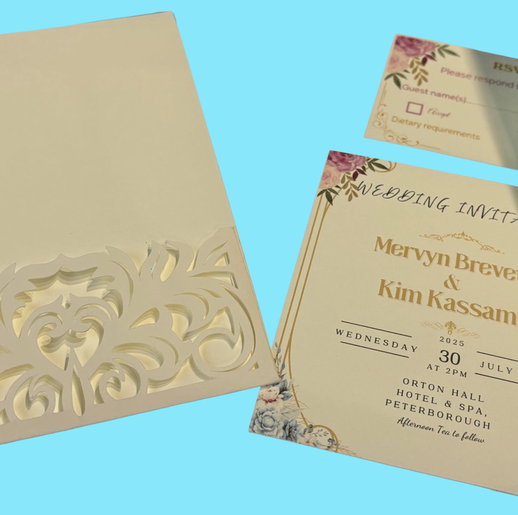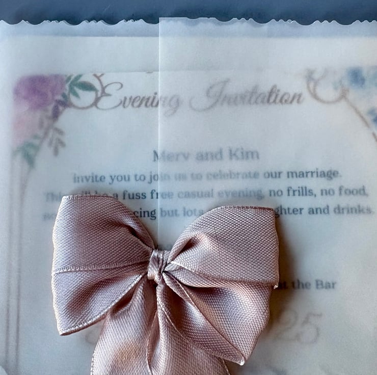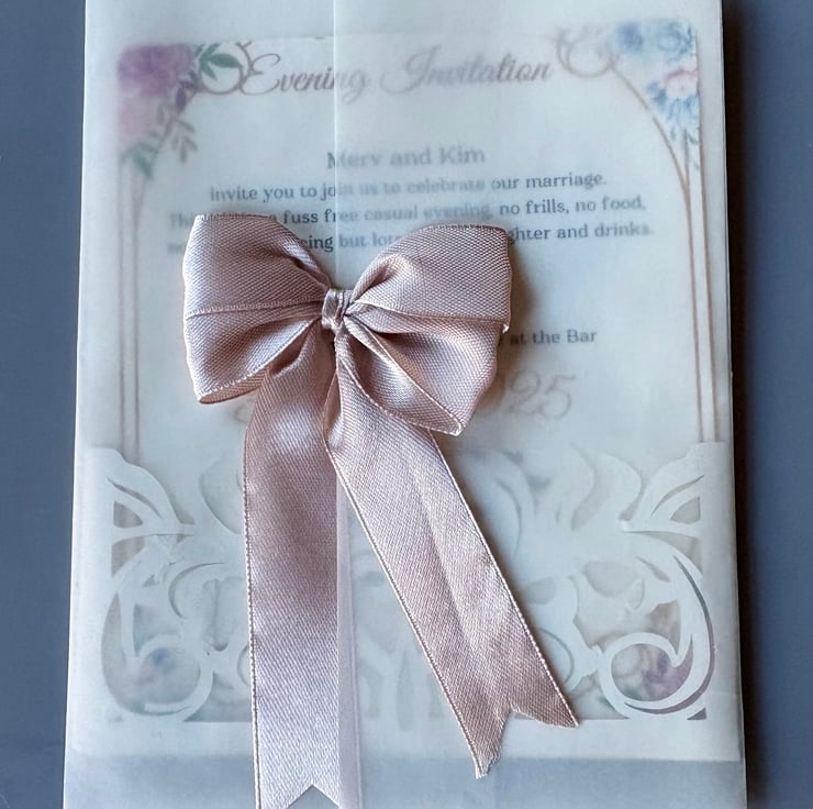 To complete the look, every invitation is wrapped in a soft vellum jacket, tied with a hand-made satin bow for that perfect romantic touch. These invitations are ideal for couples wanting something stylish, unique, and memorable without being overly formal.