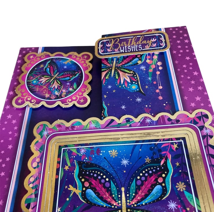 Designed in an eye-catching zig-zag style, the card features a stunning blend of purple and pink tones, complemented by colourful butterflies that bring a joyful, magical feel.