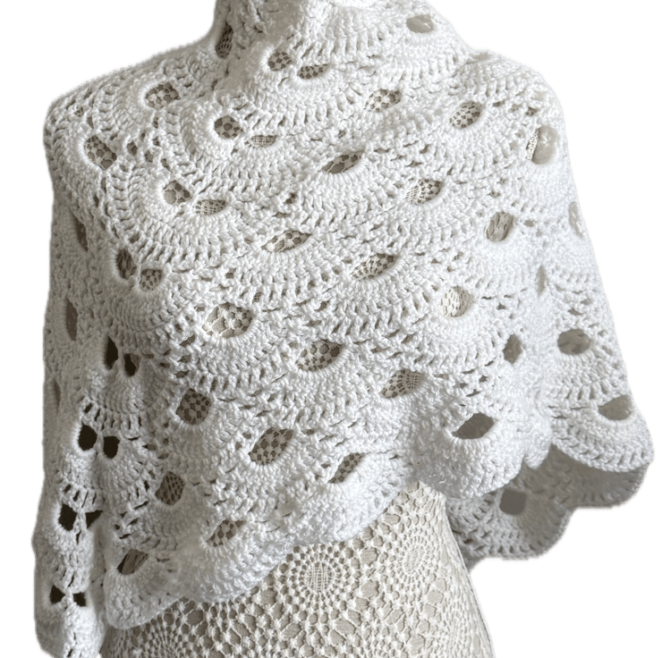 A lovely white shawl or scarf in the gorgeous virus stitch. Very cosy and will keep you warm on the winter days and nights.