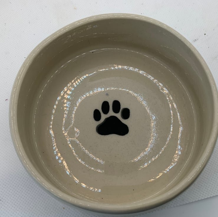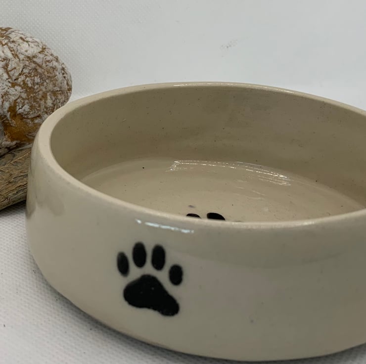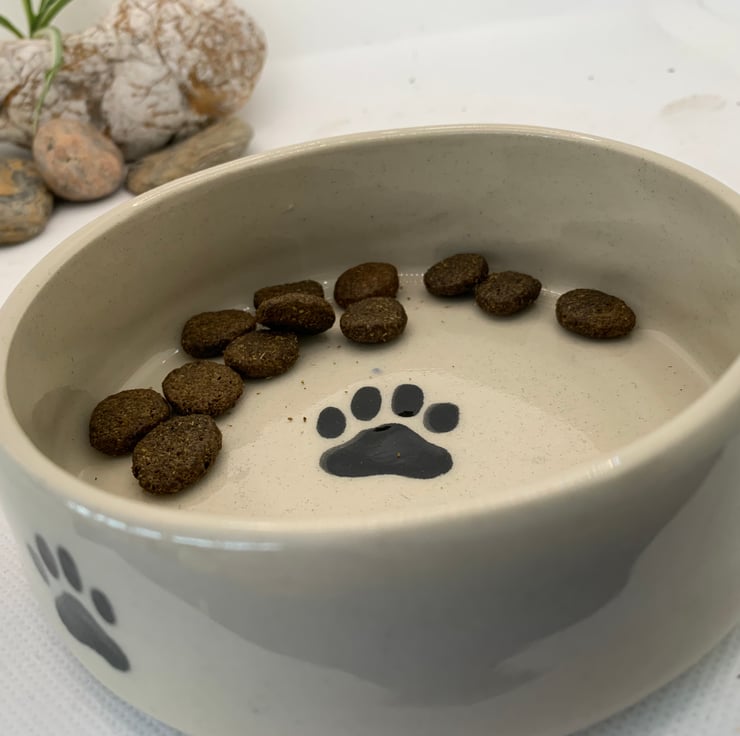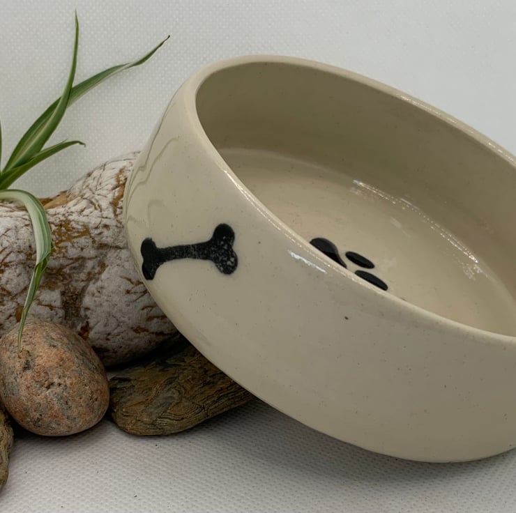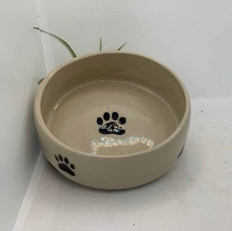 A lovely heavy bottomed pet bowl that is simply decorated with paw prints and bones.