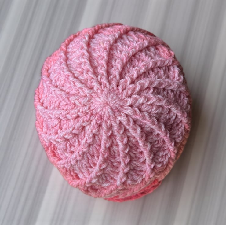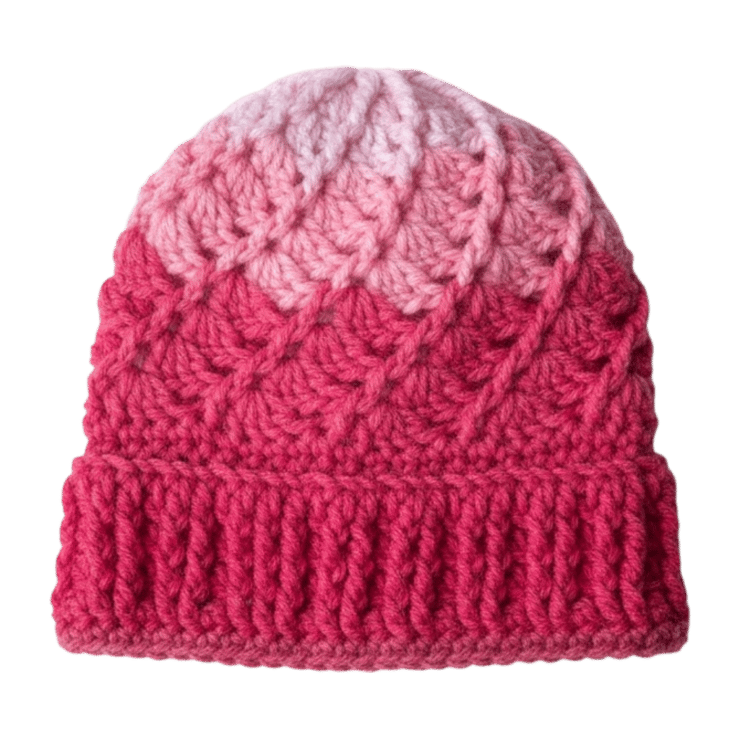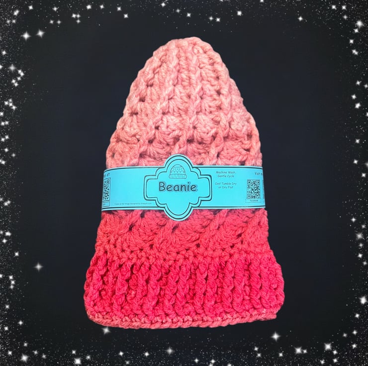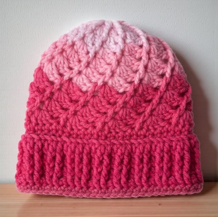 This crocheted hat has been made from a pink ombre yarn that is 80% acrylic and 20% wool. The ombre looks lovely fading from light to dark down the length of the hat. It has been made with a combination of stitches that gives it a nice spiral look. It is sure to keep your head nice and cosy for those chilly days.