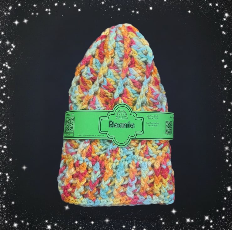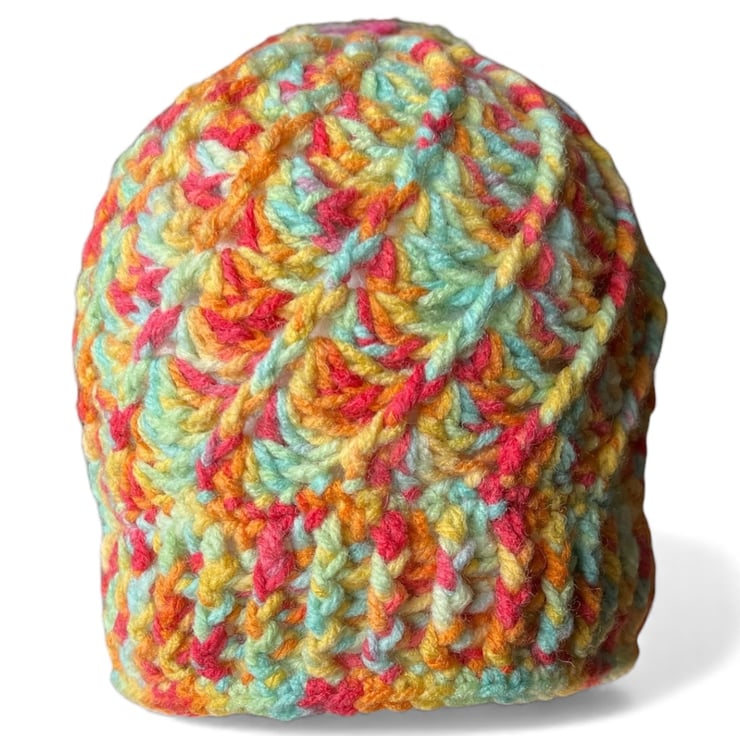 This crocheted hat has been made from a multi-coloured variegated yarn that is 80% acrylic and 20% wool. It has been made with a combination of stitches that gives it a nice spiral look. It is sure to keep your head nice and cosy for those chilly days.