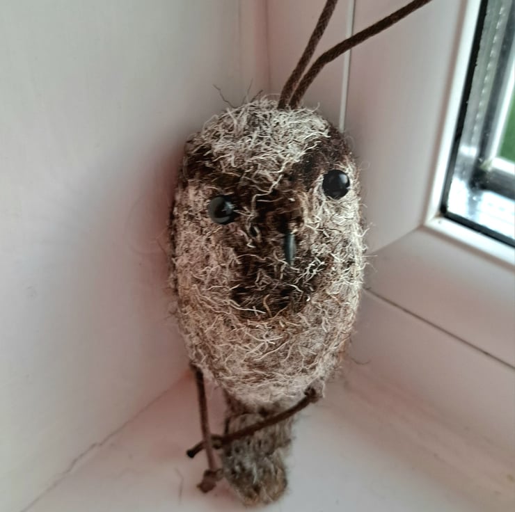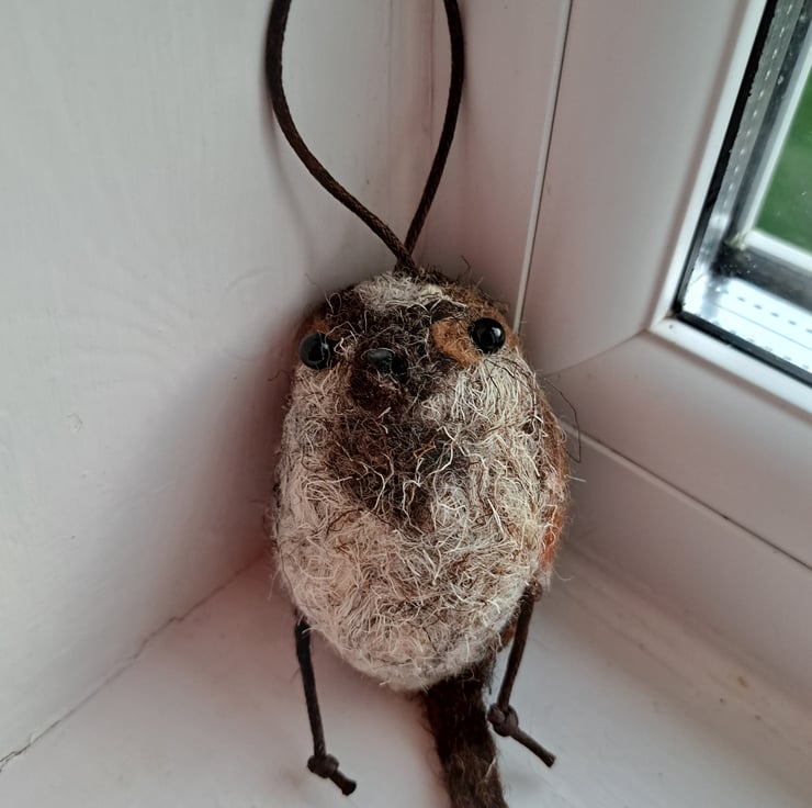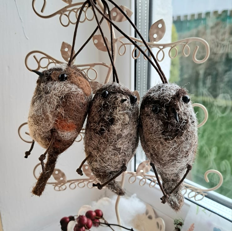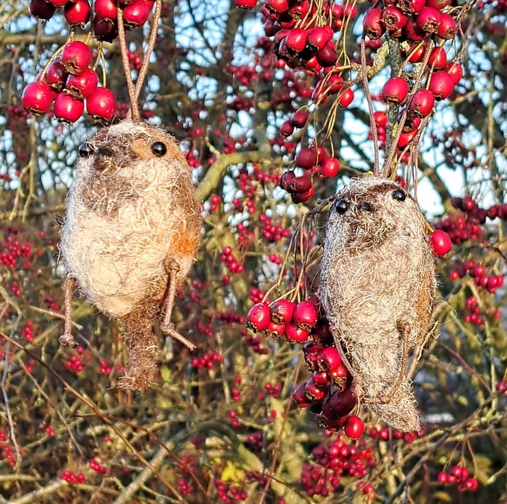 These little birds have been wet felted using natural wool fleece .Measures approx 3" tall with hanging cord.