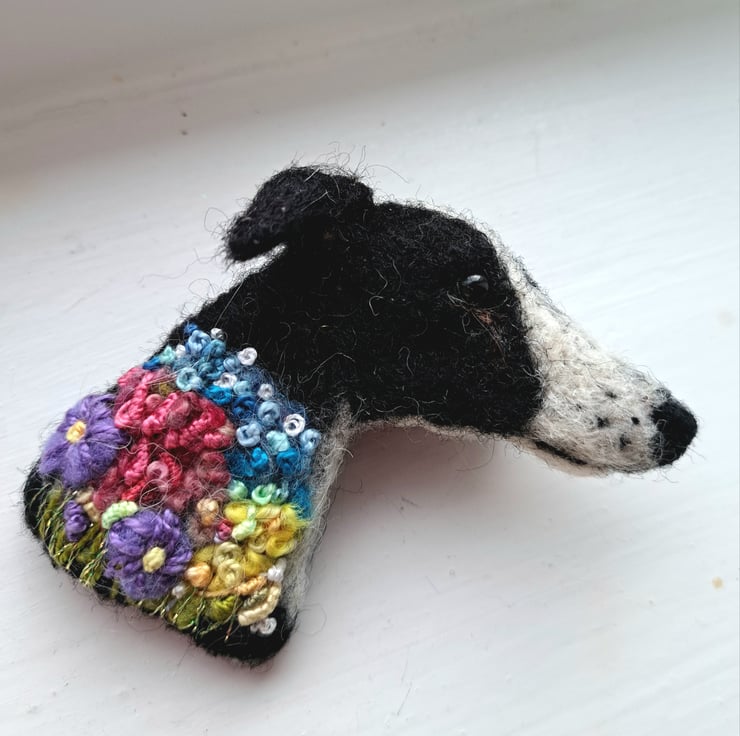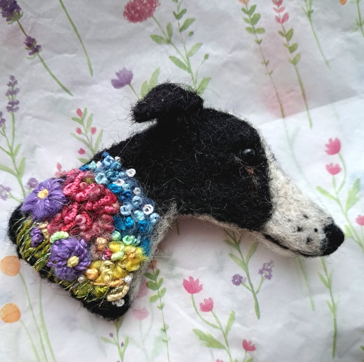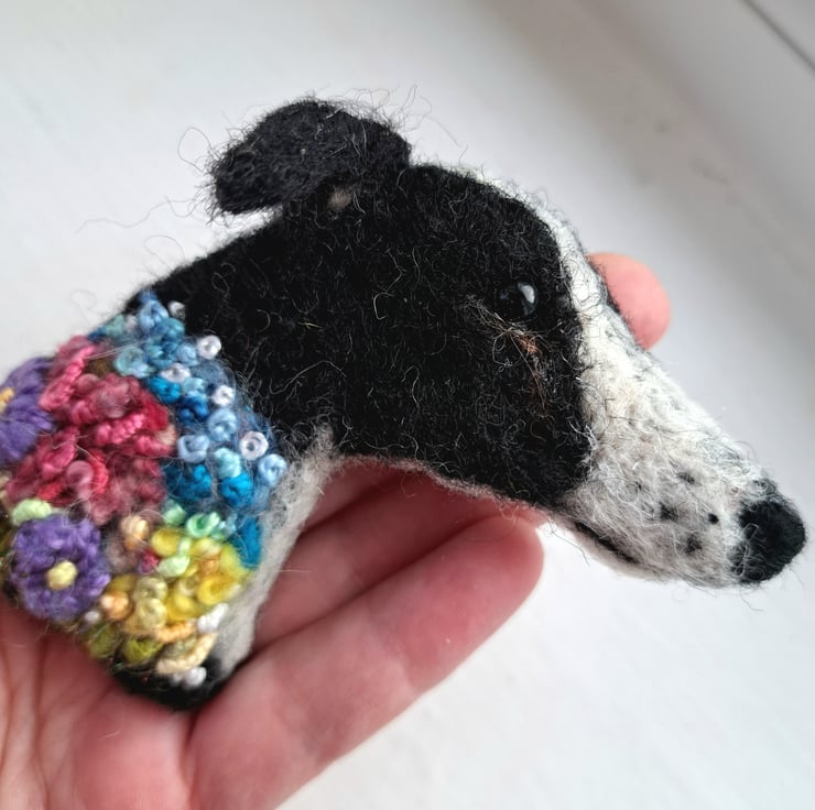 needle felted greyhound brooch,with embroidered details,approx 3 inches,metal brooch fitting to rear