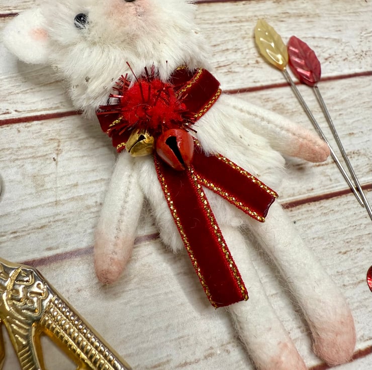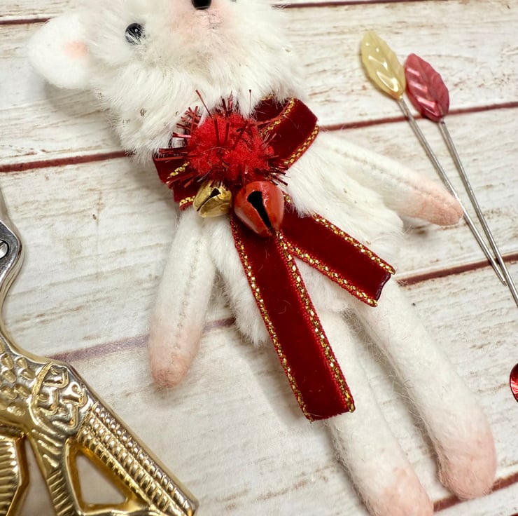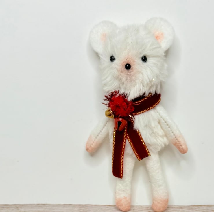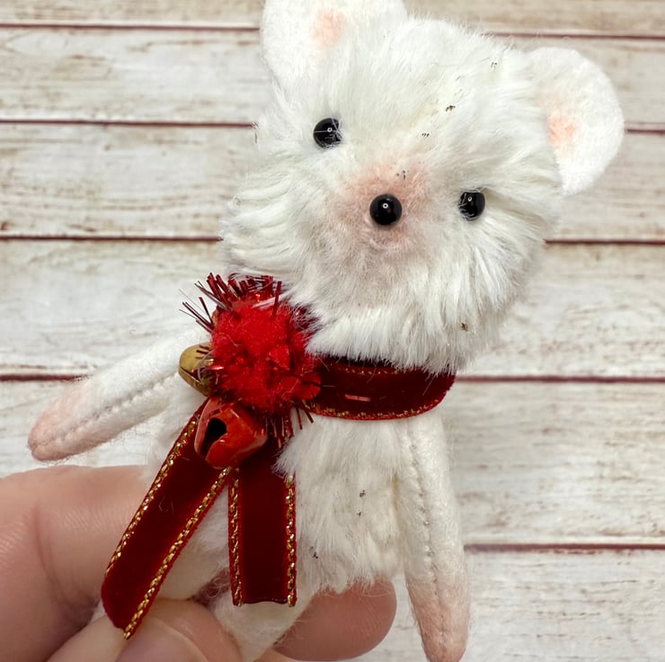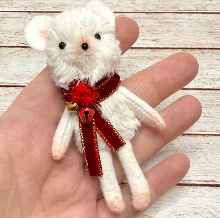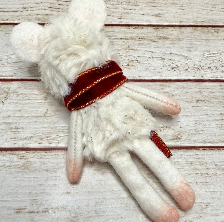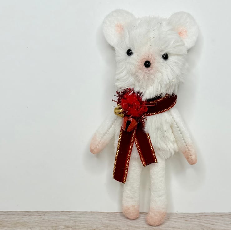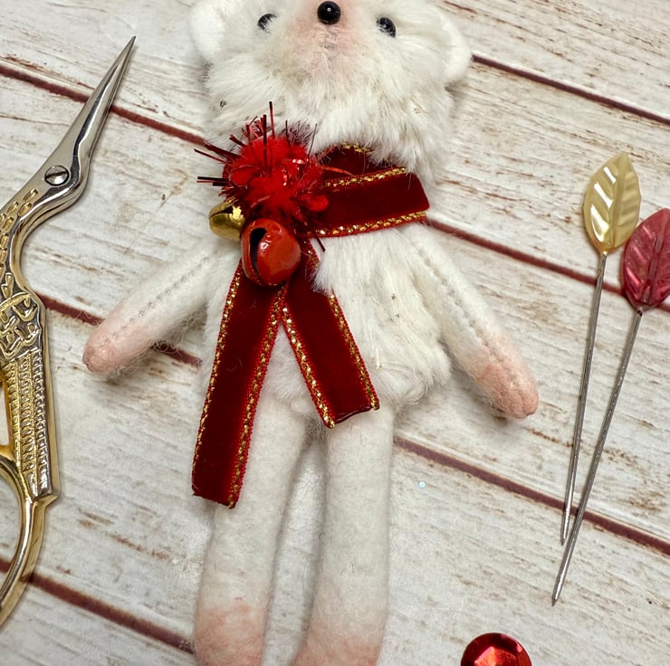 Shaded with pink. The arms legs and ears are soft felt. Mouse wears velvet trim scarf sewn into place with bells and sparkly red Pom pom. Mouse measures roughly 10cm tall. Comes with transparent loop hanger. This is for decorative only and not a toy. Sent in recyclable or recycled packaging.