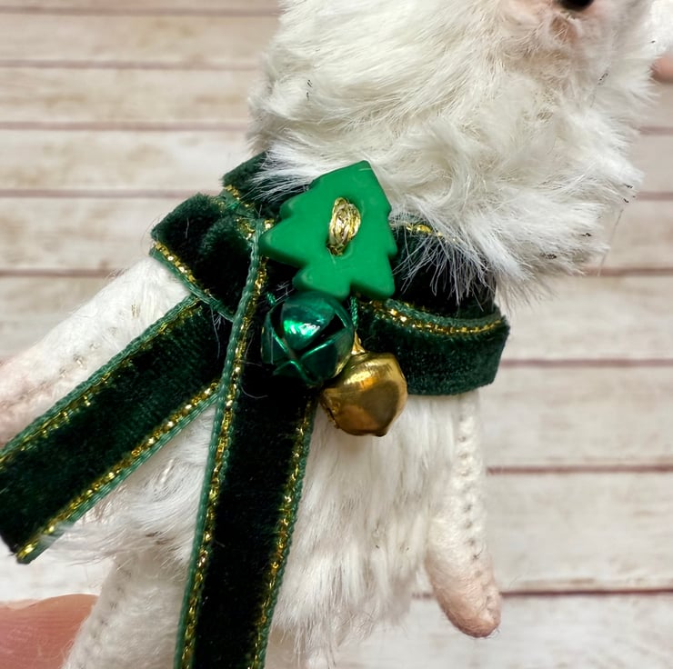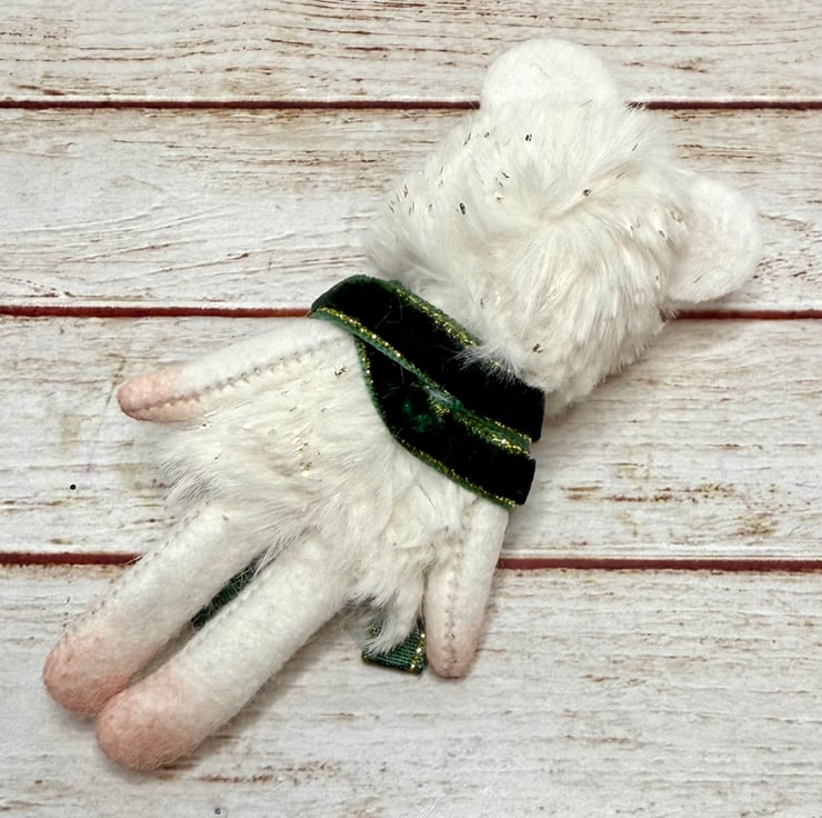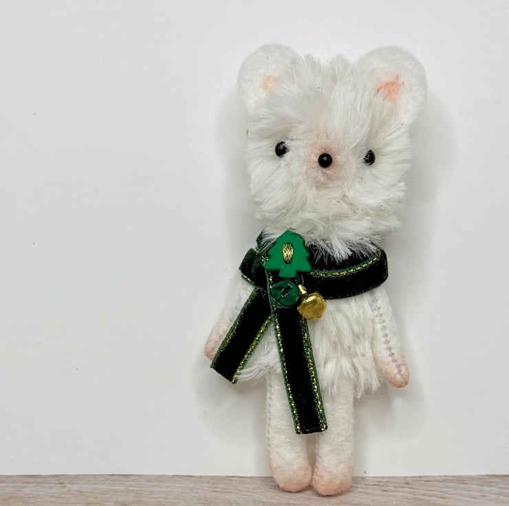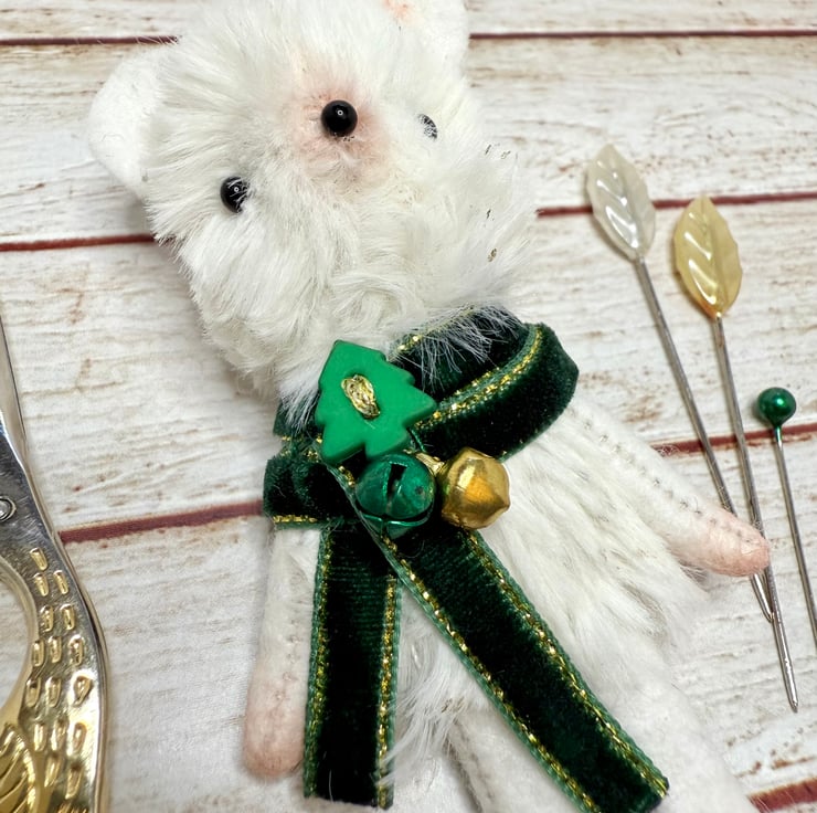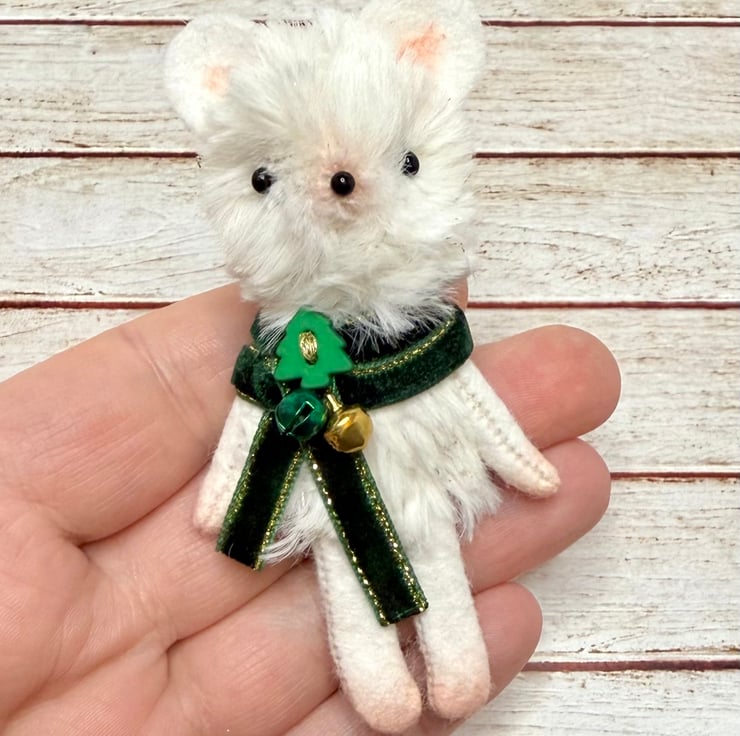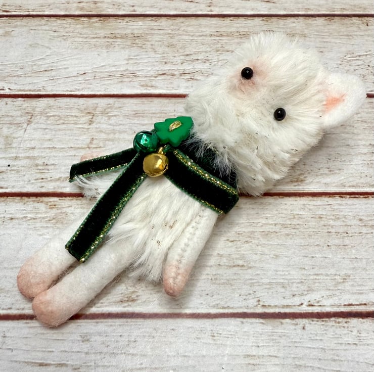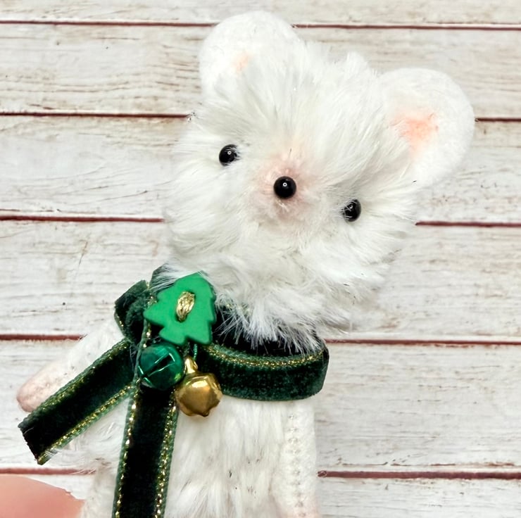 A small mouse with cream faux fur body flecked with gold. Mouse has glass bead eyes and nose. Nose, feet, ears and hands are shaded with pink. The arms legs and ears are soft felt. Mouse wears velvet trim scarf sewn into place with bells and Christmas tree bead. Mouse measures roughly 9cm tall. Comes with transparent loop hanger. This is for decorative only and not a toy. Sent in recyclable or recycled packaging.