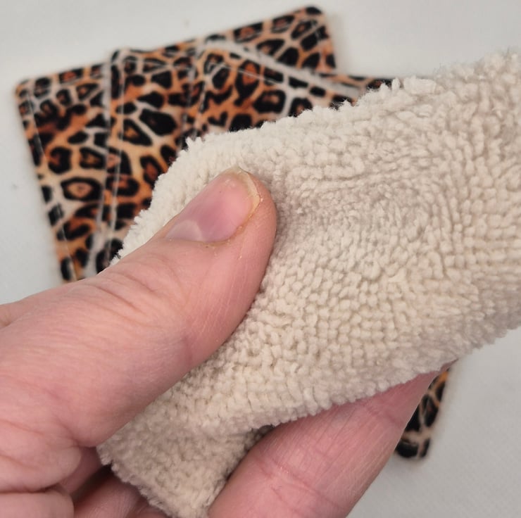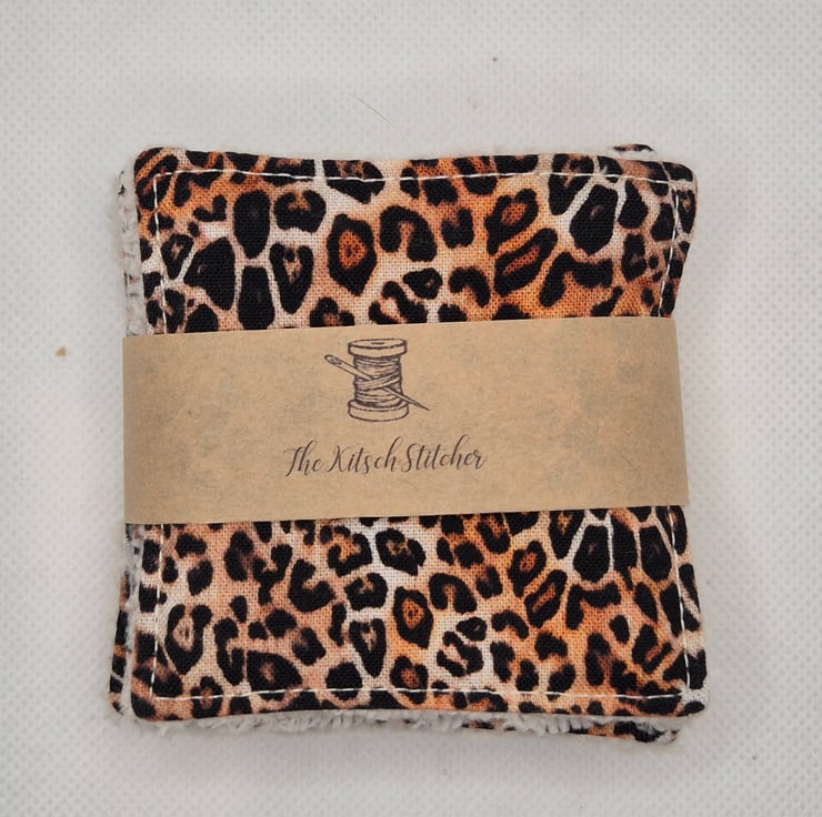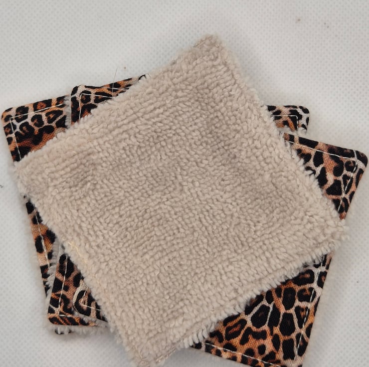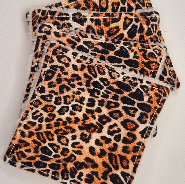 A set of 4 matching 3 inch reusable face wipes made from beatifully soft bamboo velvet towelling and 100% cotton fabric. These are cotton leopard print in traditional colours