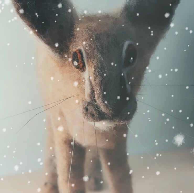 Wool sculpture of a Hare created by needle felting completely by hand using a blend of Bergschaf wool & Merino for the white fluffy areas