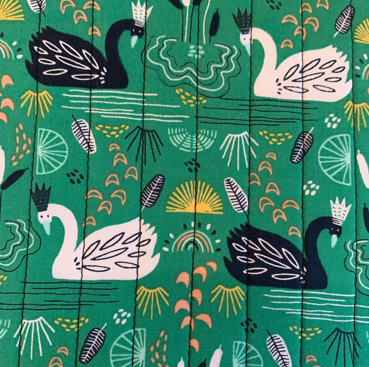 It is made with this fun swans wearing crowns fabric on a green colour background.