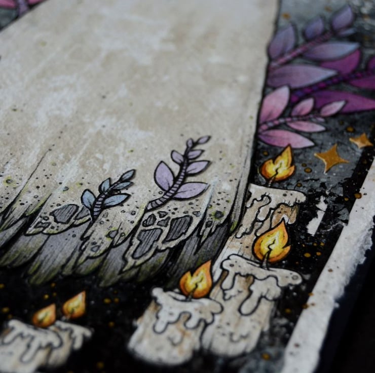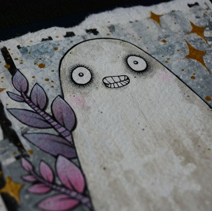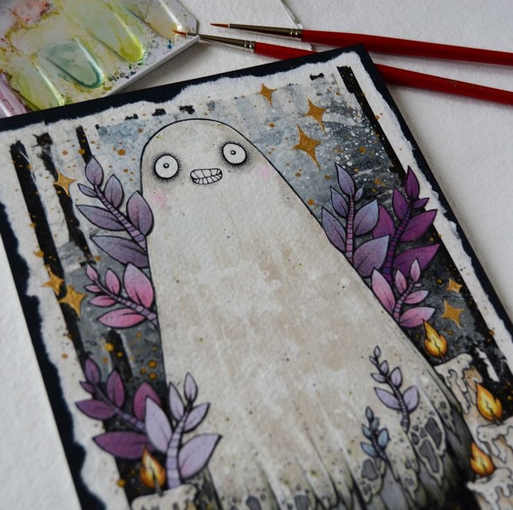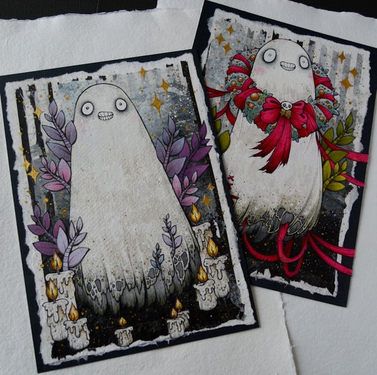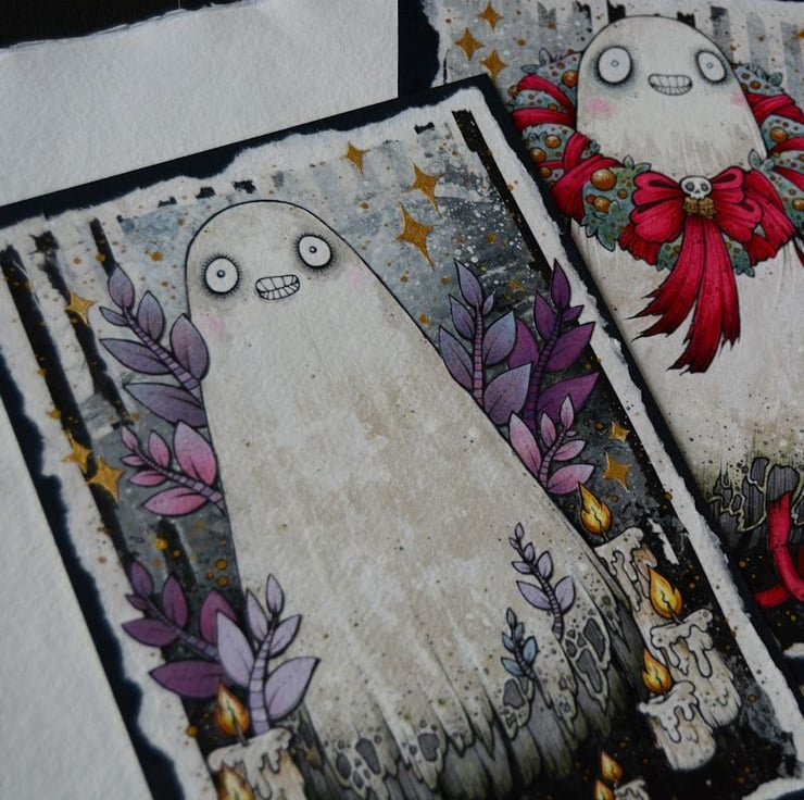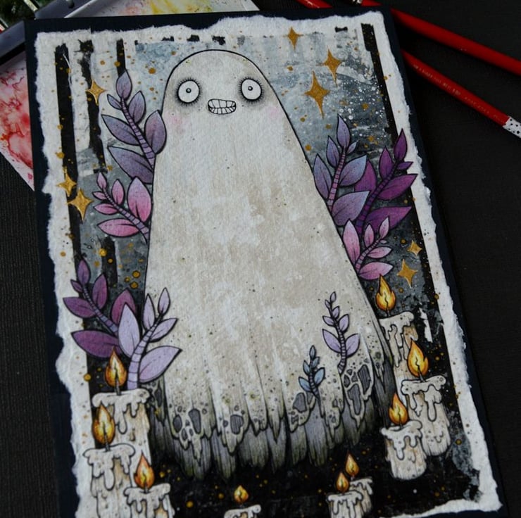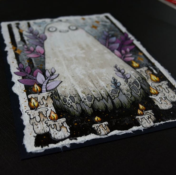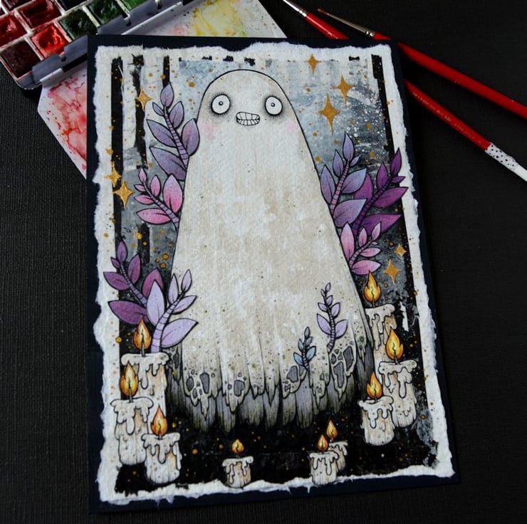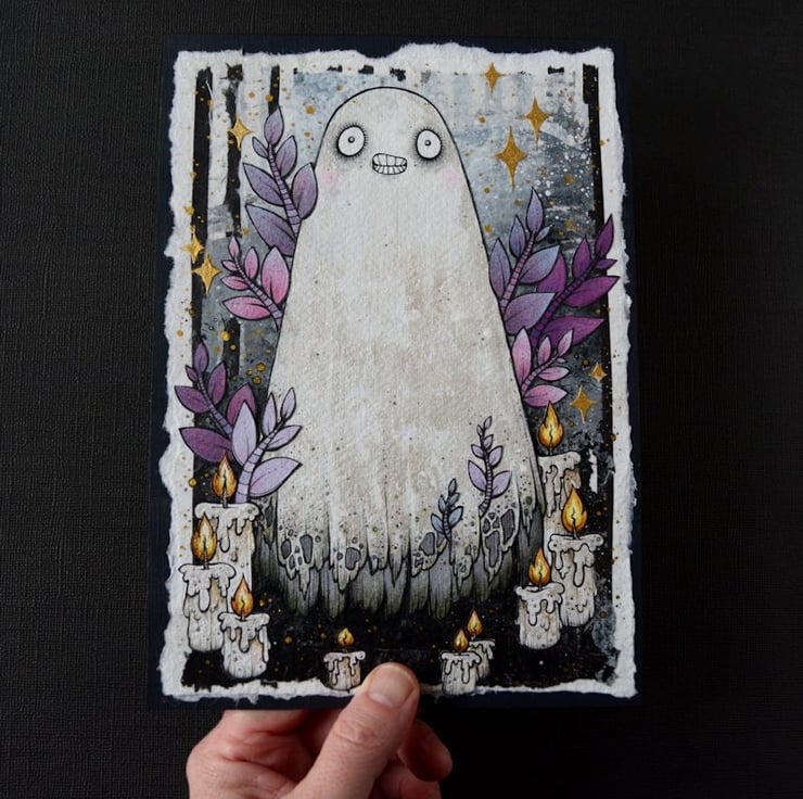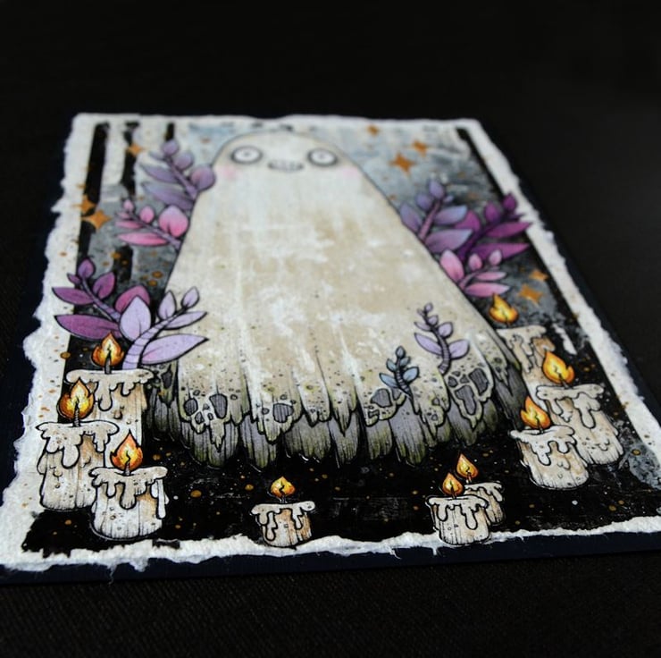 this unique artwork is an original collaged piece, on khadi paper. the ghost, leaves and candles are hand drawn on separate pieces of khadi paper, coloured with art pens and watercolour paints, and each component is then cut out, and layered on to a background of handmade paper and painted tissue paper. the whole piece is then mounted onto an A5 sized piece of textured paper (300gsm), which i have painted with a paynes grey to give a dark surround/background.