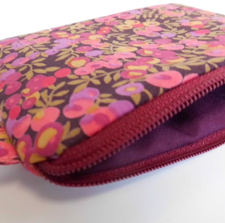 This coin purse is made using the vibrant Liberty "Wiltshire" print, a leaf and berry print in pinks and mauves. I backed the fabric with fusible fleece and then machined three lines of wave stitch in burgundy thread across each side to give it cushioning, stability and a quality feel. Lined with a plain purple fabric which complements the main fabric very nicely. I inserted a practical key ring loop into one side and this is topstitched with burgundy thread.