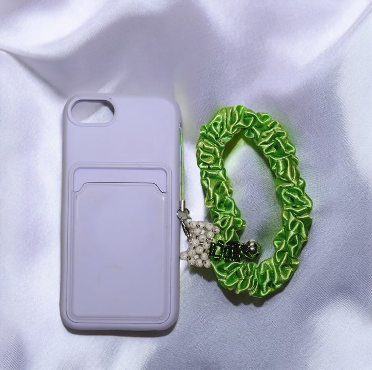 Carry your device with a touch of colour and handmade charm. This phone strap features a soft, ruched loop made from green satin ribbon, paired with clusters of white and green beads for a playful yet elegant finish. A tiny metal bell adds a light jingle, bringing extra personality to your everyday accessories.