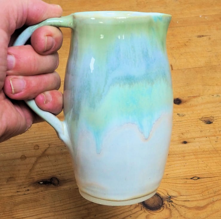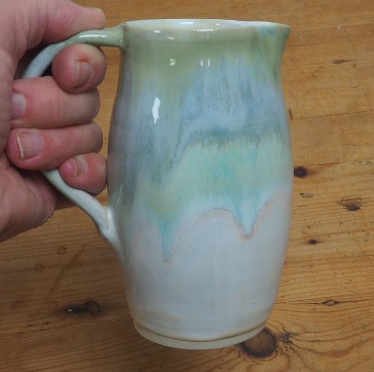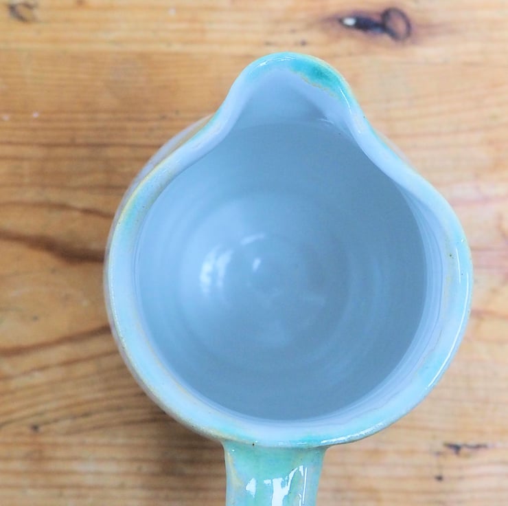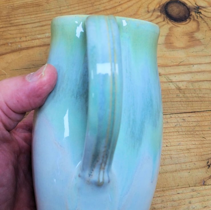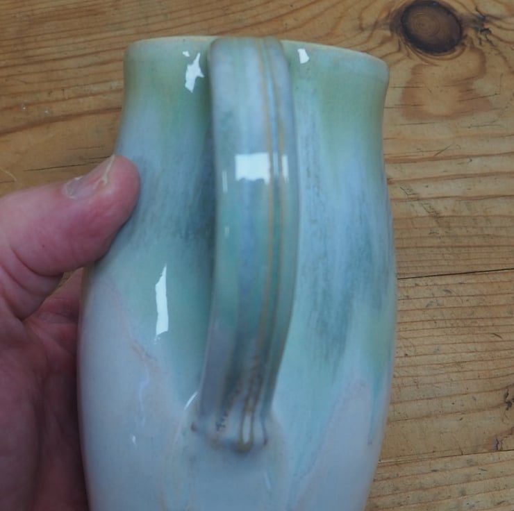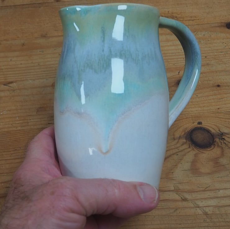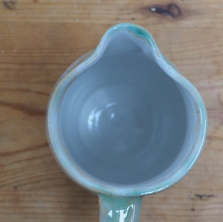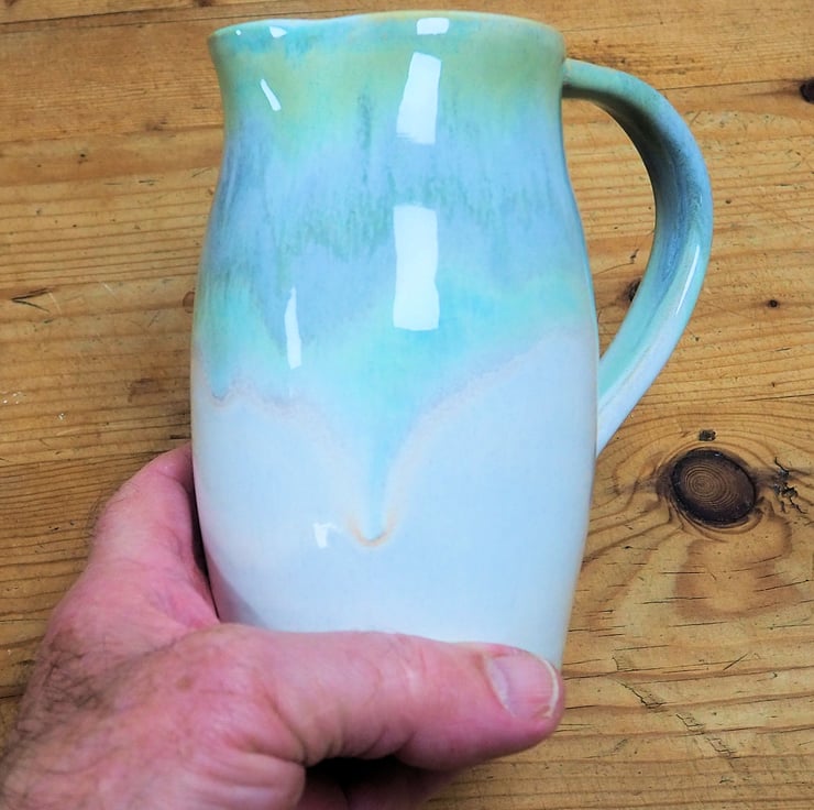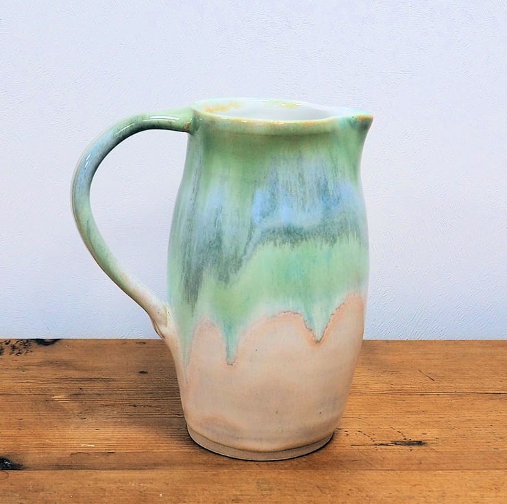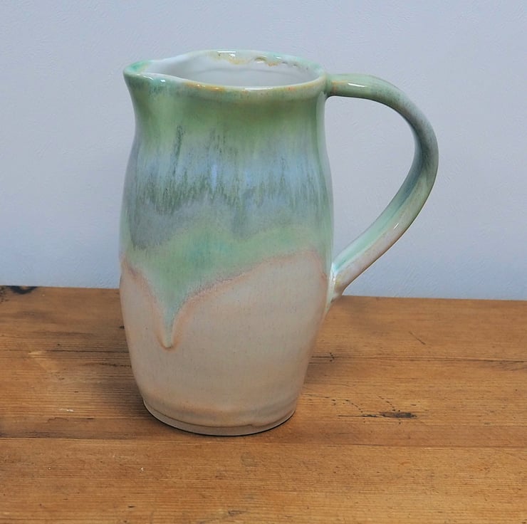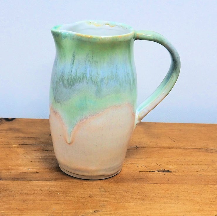 Stoneware jug or pitcher. Hand thrown on my potters wheel. Layered greens and cream glaze with pink tones. Gloss white glaze inside.
