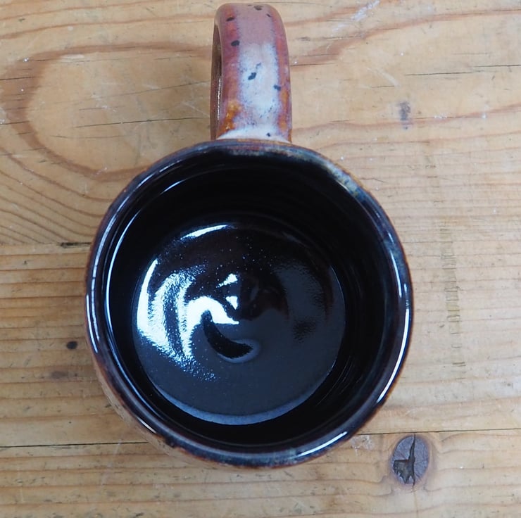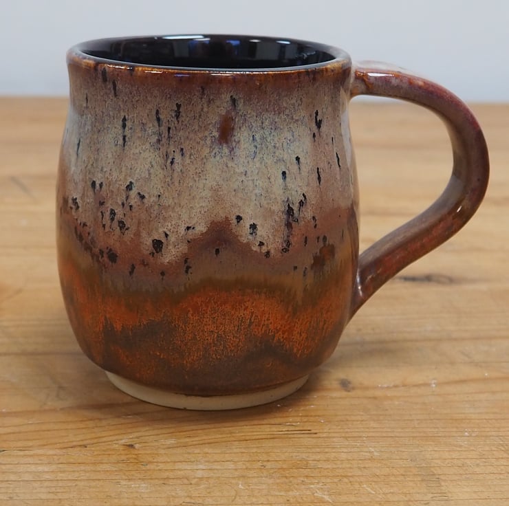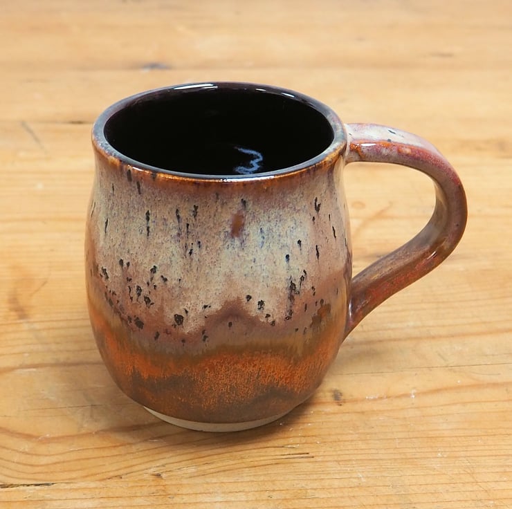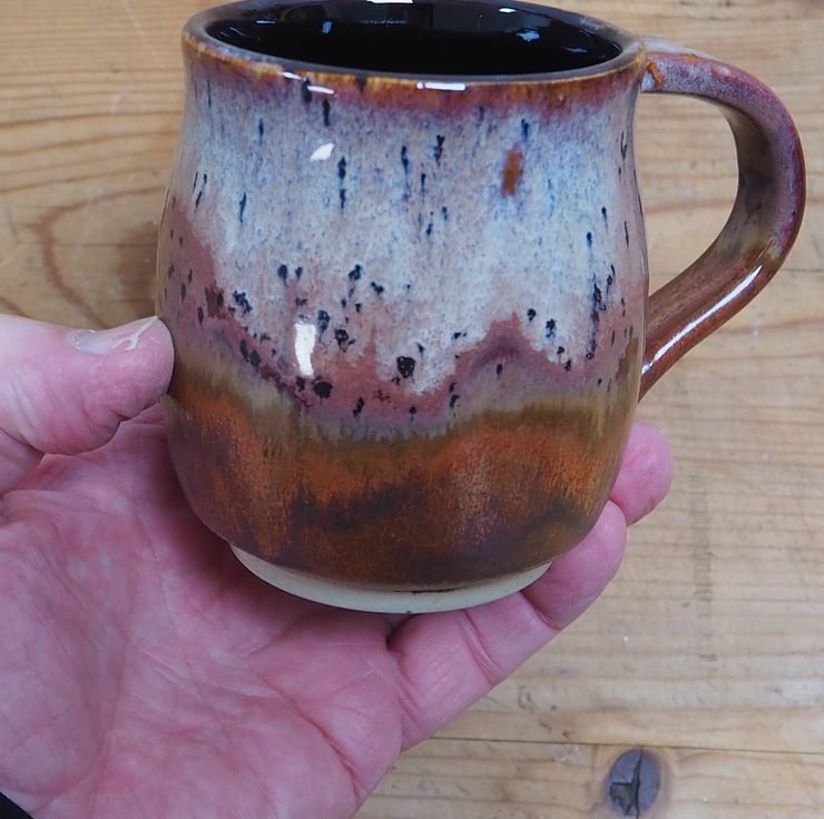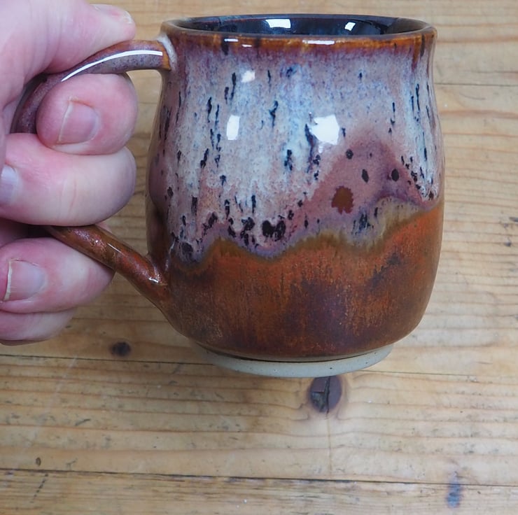 Coffee, tea or hot chocolate mug. Hand thrown on my potters wheel and glazed in a multi-coloured purple and copper with black glaze inside.