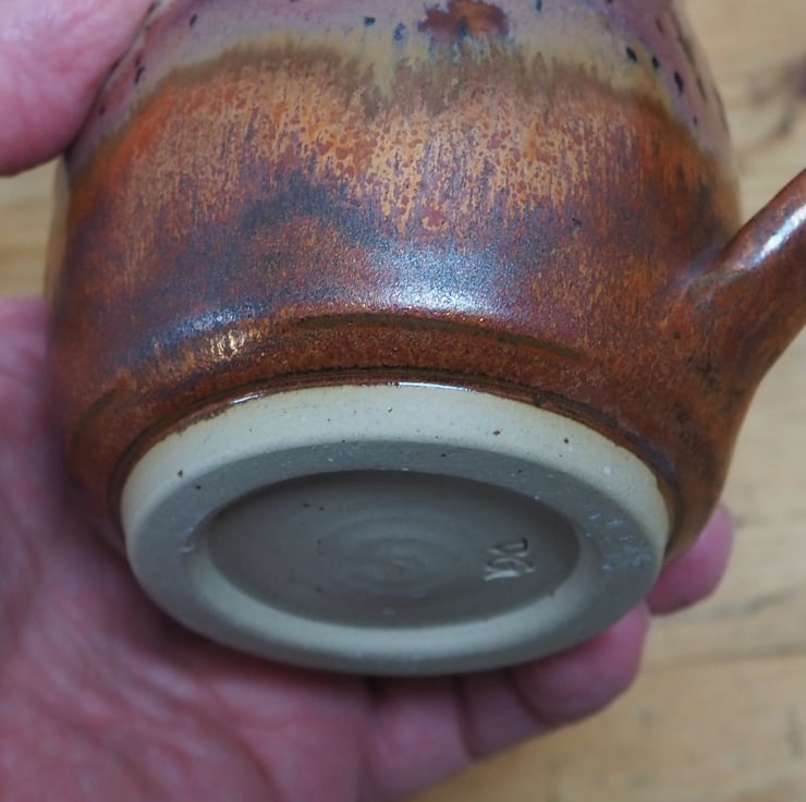 Large stoneware pottery mug finished in multi-coloured purple and copper glaze.