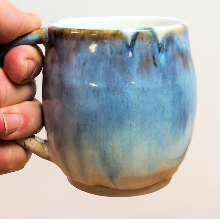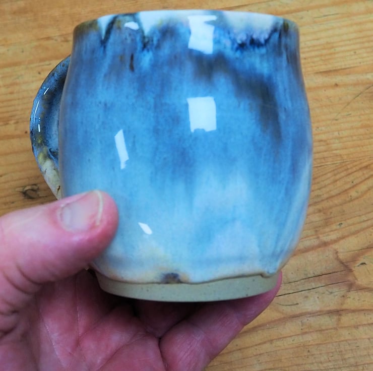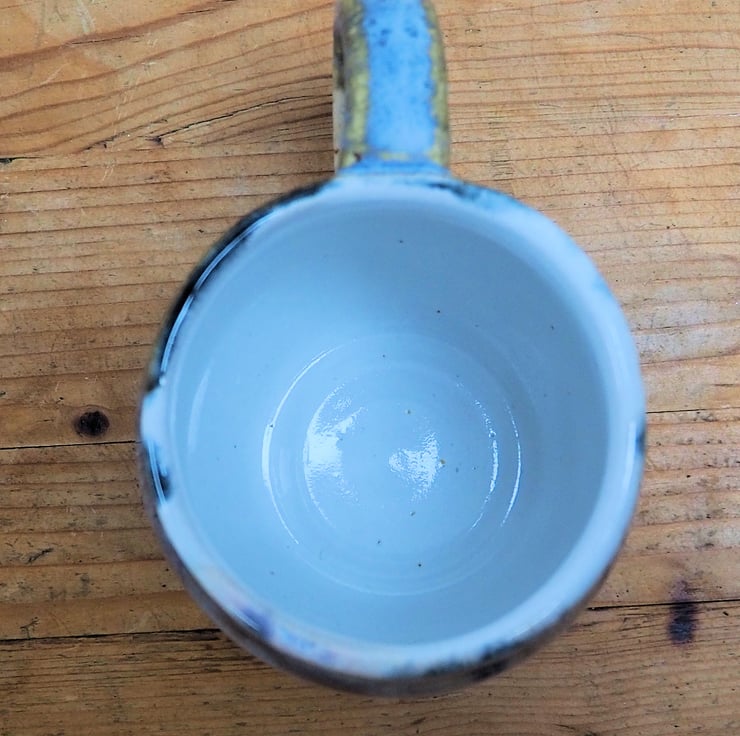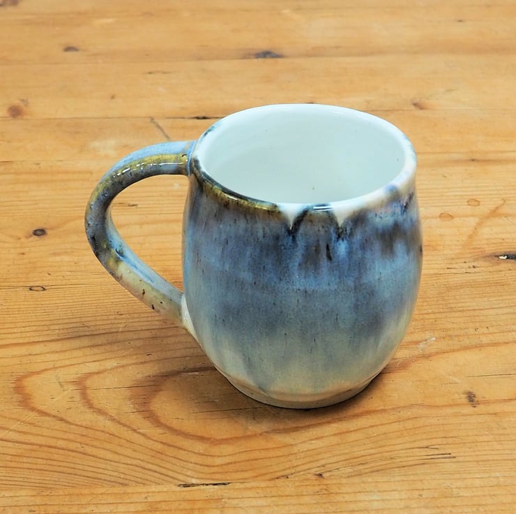 Coffee, tea or hot chocolate mug. Hand thrown on my potters wheel and glazed in a multi-coloured blue and cream glaze with white glaze inside.