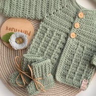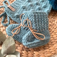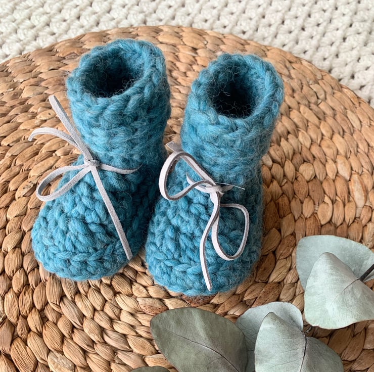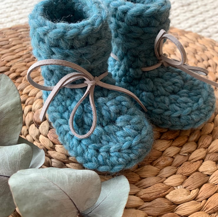 These booties are ready to post and fit approx 3-6m. Foot length is approx 10cm.