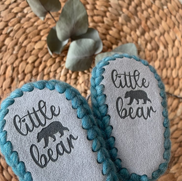 The main feature of these booties are the faux suede “little bear” soles. They have a thin layer of white micro fleece on the inside sole to add warmth. The soles are a soft grey and match the ties.