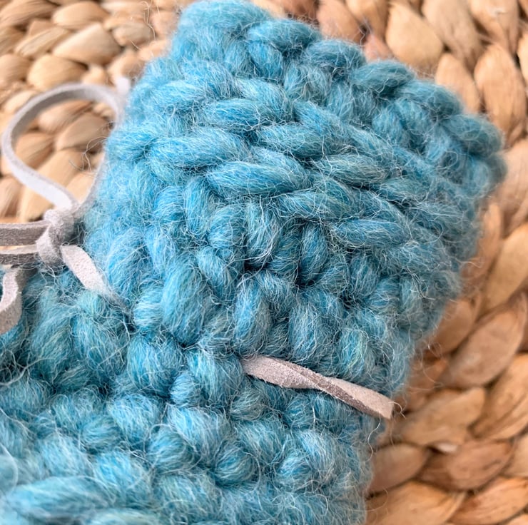 Hand crocheted by me using chunky weight 100% wool in a lovely neutral teal colour.