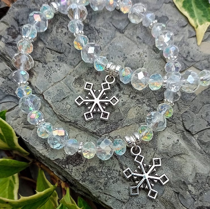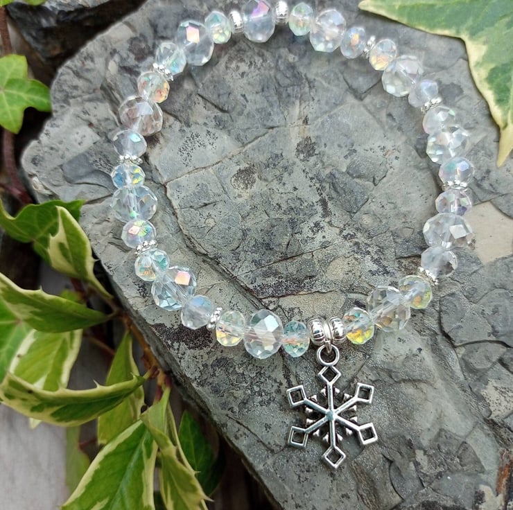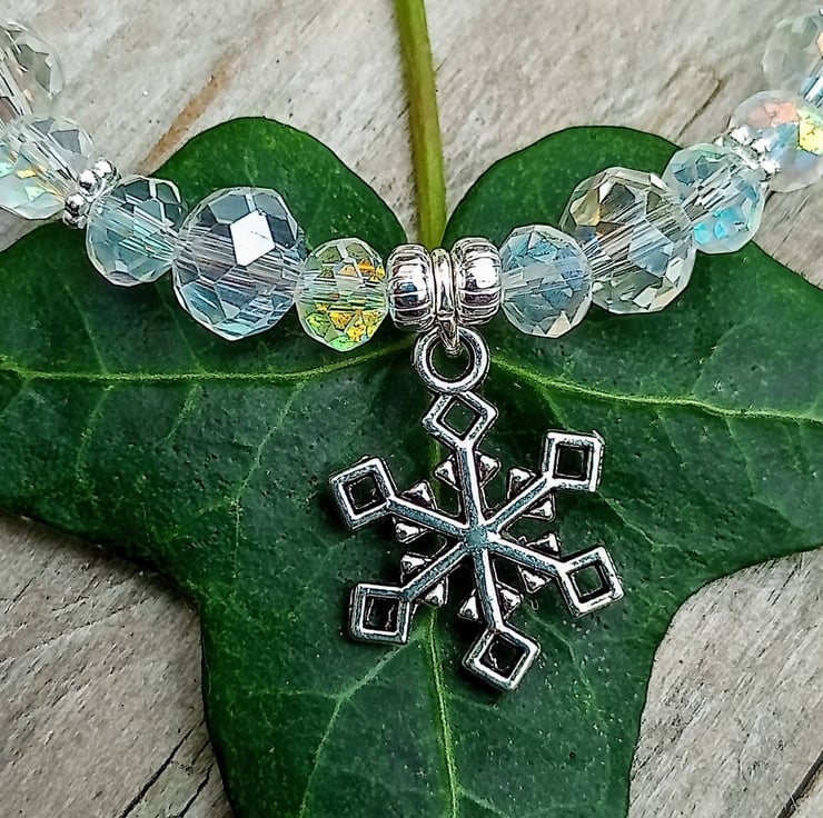 Crystal Snowflake handmade bracelet. With gorgeous iridescent handcut faceted glass crystals and tibetan silver Snowflake charm.