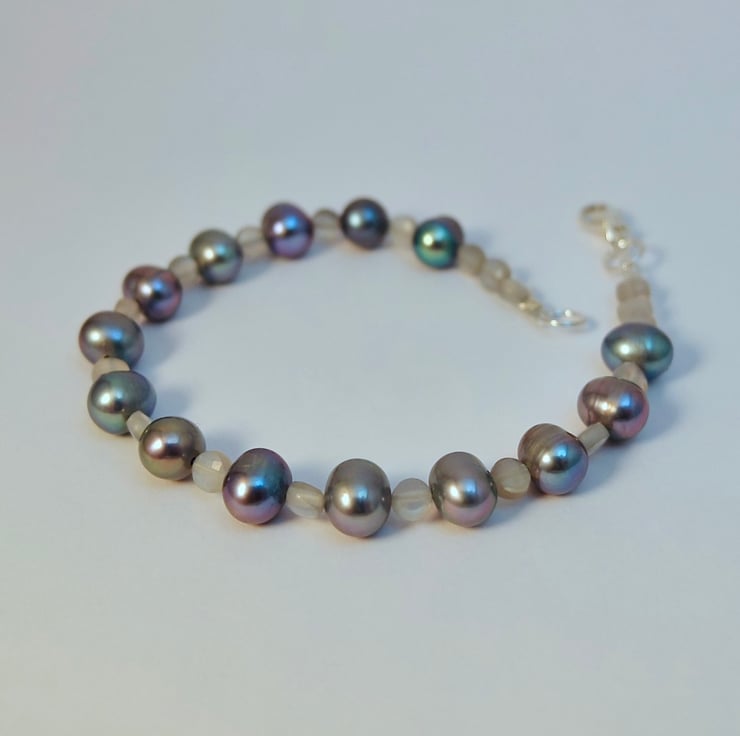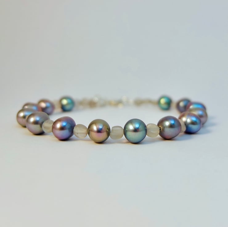 Potato Pearls are not-quite-round, and have slight surface irregularities. These ones have a silver-grey main colour, with overtones of iridescent 'peacock' colours - hints of green, blue, bronze and purple.