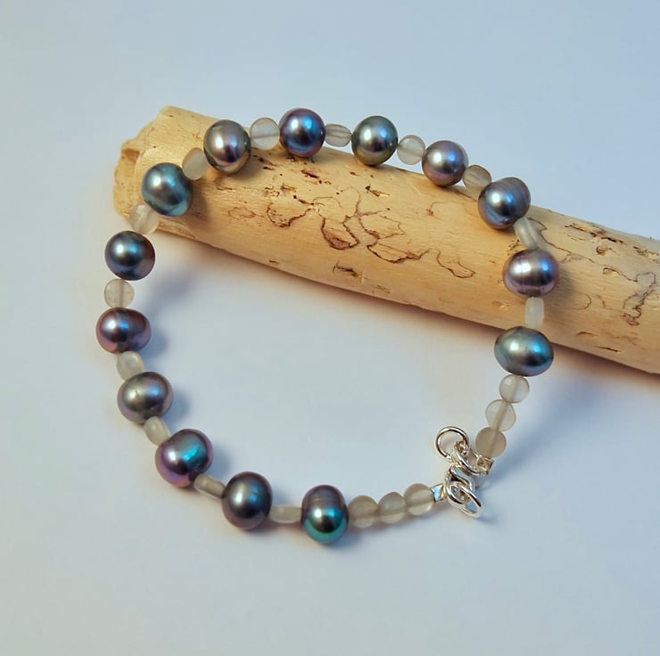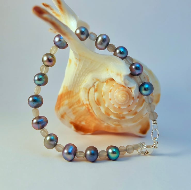 These stunning Freshwater silver-grey peacock potato Pearls measure approximately 6-7mm and have a beautiful iridescent sheen of silvery blue, green, bronze and mauve over a silver-grey base colour.